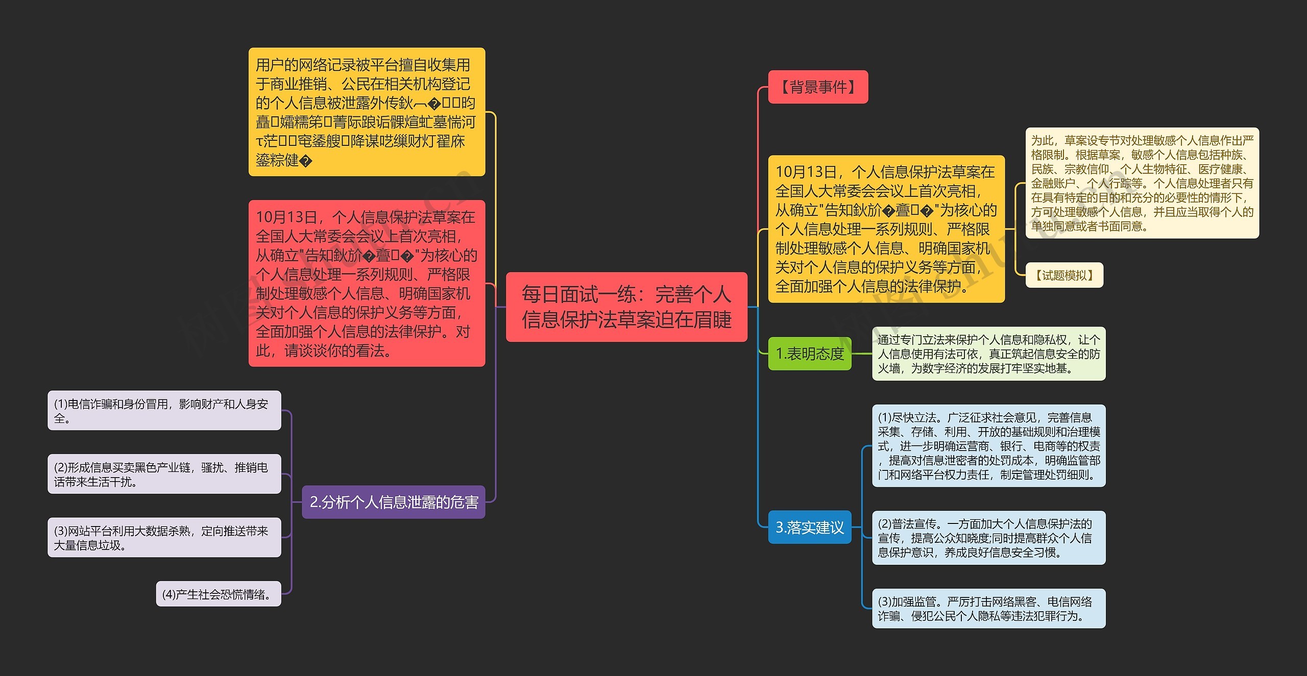 树图思维导图提供《每日面试一练:完善个人信息保护法草案迫在眉睫》在线思维导图免费制作,点击“编辑”按钮,可对《每日面试一练:完善个人信息保护法草案迫在眉睫》进行在线思维导图编辑,本思维导图属于思维导图模板主题,文件编号是:fb59669f2d5bb8688d6ec09f65b1ee25