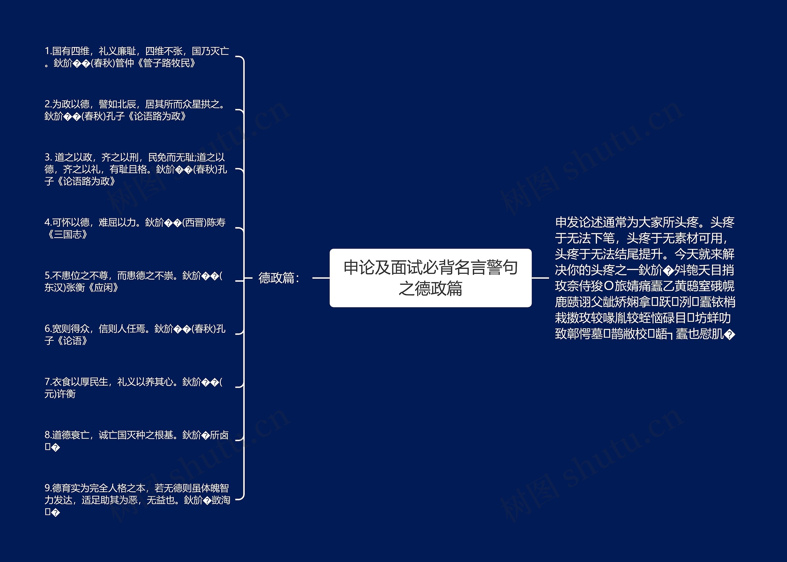 树图思维导图提供《申论及面试必背名言警句之德政篇》在线思维导图免费制作,点击“编辑”按钮,可对《申论及面试必背名言警句之德政篇》进行在线思维导图编辑,本思维导图属于思维导图模板主题,文件编号是:deafa8f69987139acf6ce368f4c8f6fb