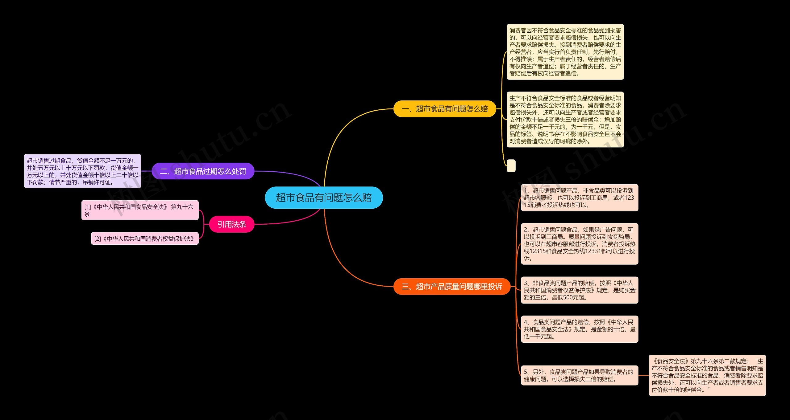 树图思维导图提供《超市食品有问题怎么赔》在线思维导图免费制作,点击“编辑”按钮,可对《超市食品有问题怎么赔》进行在线思维导图编辑,本思维导图属于思维导图模板主题,文件编号是:baaf95c23e304a15c38b95167beb5380