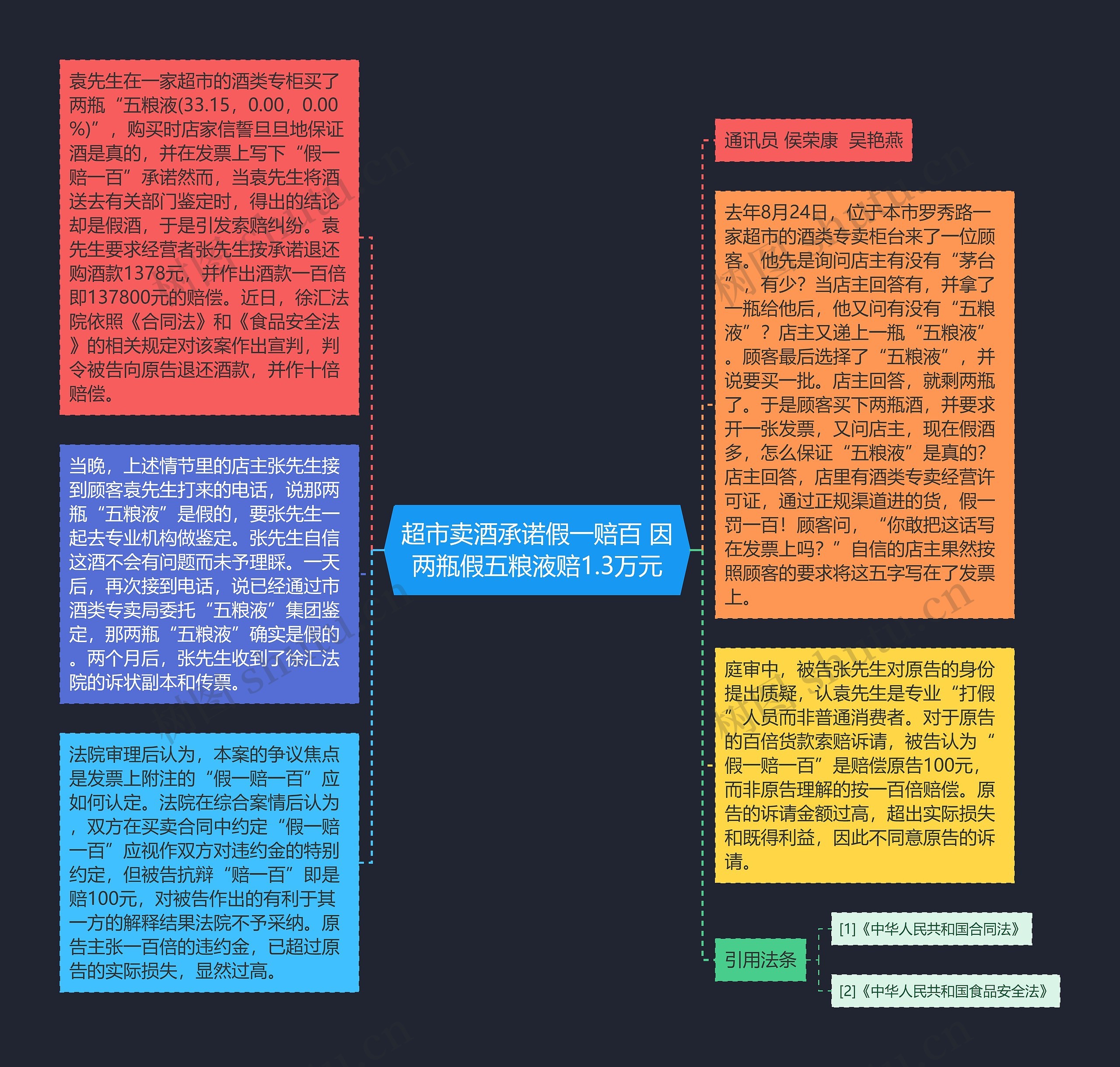 袁先生在一家超市的酒类专柜买了两瓶“五粮液(33.15,0.00,0.00%)”,购买时店家信誓旦旦地保证酒是真的,并在发票上写下“假一赔一百”承诺然而,当袁先生将酒送去有关部门鉴定时,得出的结论却是假酒,于是引发索赔纠纷。袁先生要求经营者张先生按承诺退还购酒款1378元,并作出酒款一百倍即137800元的赔偿。近日,徐汇法院依照《合同法》和《食品安全法》的相关规定对该案作出宣判,判令被告向原告退还酒款,并作十倍赔偿。