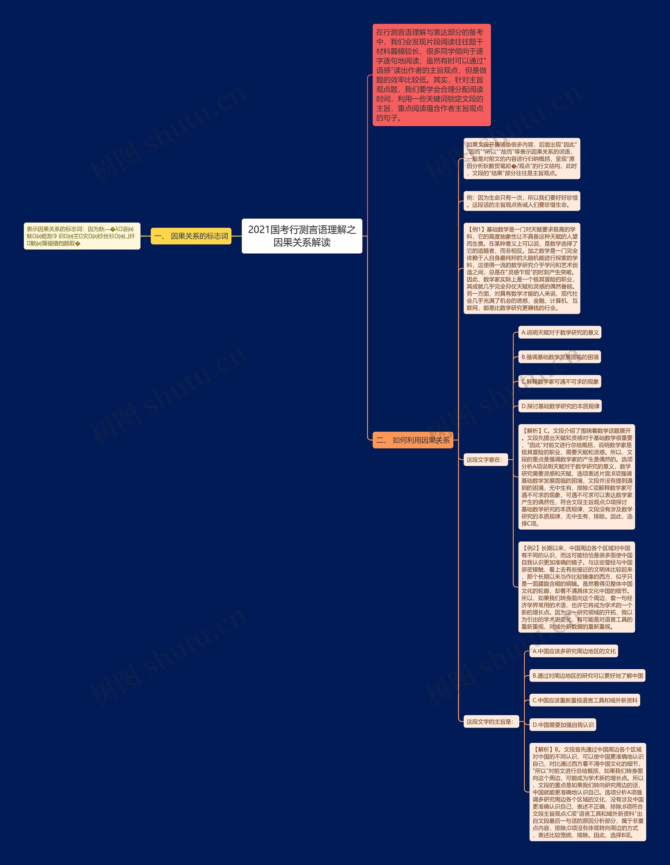 如果文段开篇铺垫很多内容,后面出现"因此""因而""所以""故而"等表示因果关系的词语,一般是对前文的内容进行归纳概括,呈现"原因分析鈥數贸鼋崧�/观点"的行文结构,此时,文段的"结果"部分往往是主旨观点。