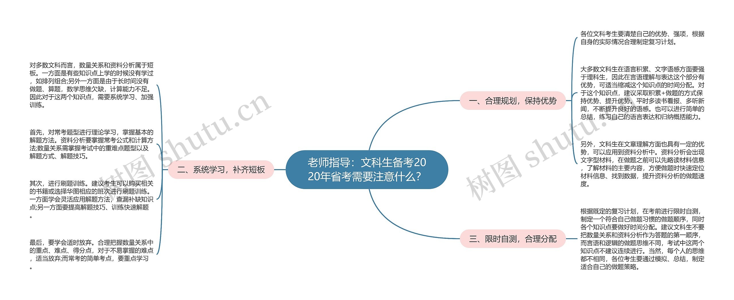 树图思维导图提供《老师指导:文科生备考2020年省考需要注意什么?》在线思维导图免费制作,点击“编辑”按钮,可对《老师指导:文科生备考2020年省考需要注意什么?》进行在线思维导图编辑,本思维导图属于思维导图模板主题,文件编号是:88925f7eb27d182099208ea671cc8e24