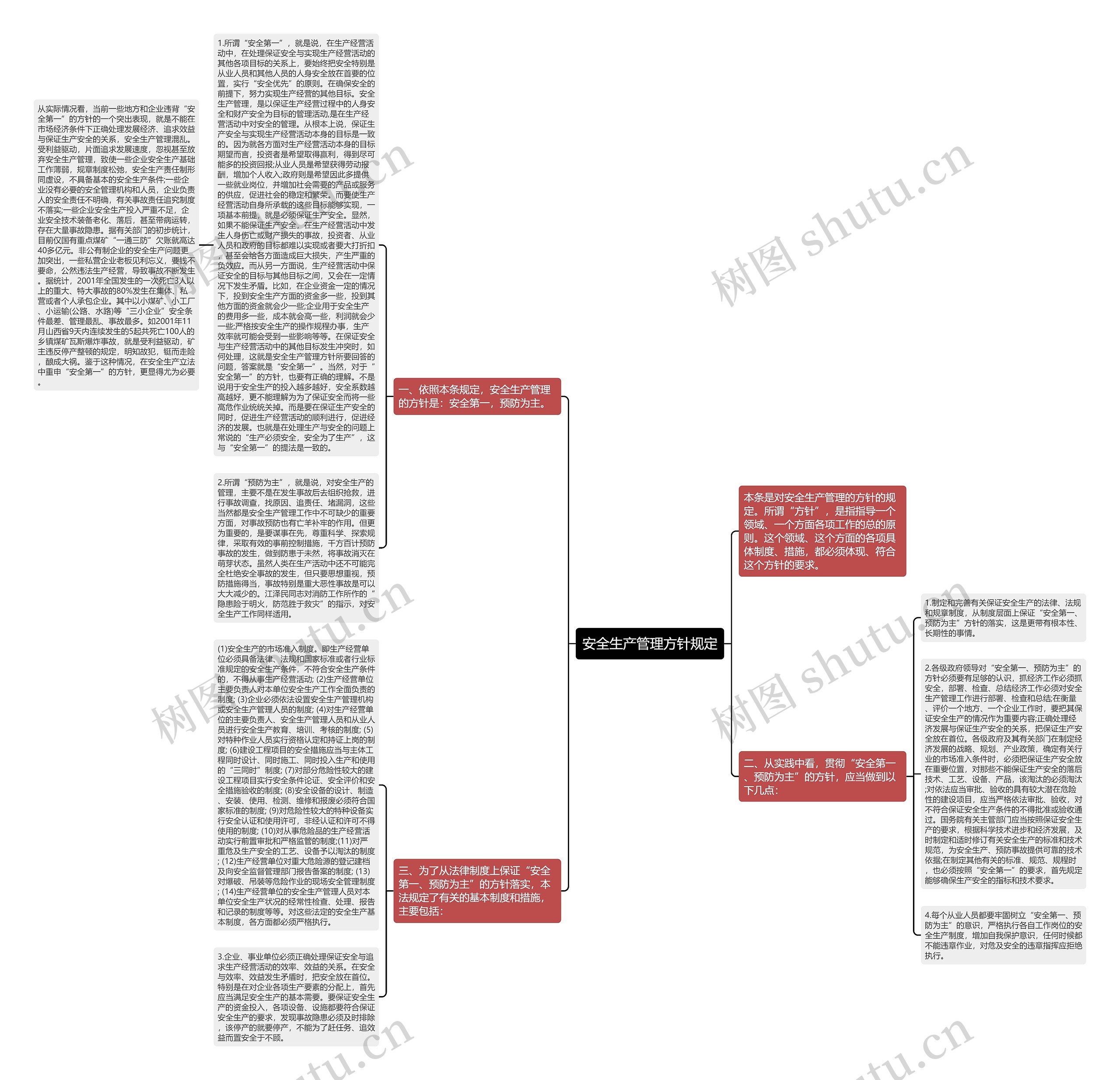 1.所谓“安全第一”,就是说,在生产经营活动中,在处理保证安全与实现生产经营活动的其他各项目标的关系上,要始终把安全特别是从业人员和其他人员的人身安全放在首要的位置,实行“安全优先”的原则。在确保安全的前提下,努力实现生产经营的其他目标。安全生产管理,是以保证生产经营过程中的人身安全和财产安全为目标的管理活动,是在生产经营活动中对安全的管理。从根本上说,保证生产安全与实现生产经营活动本身的目标是一致的。因为就各方面对生产经营活动本身的目标期望而言,投资者是希望取得赢利,得到尽可能多的投资回报;从业人员是希望获得劳动报酬,增加个人收入;政府则是希望因此多提供一些就业岗位,并增加社会需要的产品或服务的供应,促进社会的稳定和繁荣。而要使生产经营活动自身所承载的这些目标能够实现,一项基本前提,就是必须保证生产安全。显然,如果不能保证生产安全,在生产经营活动中发生人身伤亡或财产损失的事故,投资者、从业人员和政府的目标都难以实现或者要大打折扣,甚至会给各方面造成巨大损失,产生严重的负效应。而从另一方面说,生产经营活动中保证安全的目标与其他目标之间,又会在一定情况下发生矛盾。比如,在企业资金一定的情况下,投到安全生产方面的资金多一些,投到其他方面的资金就会少一些;企业用于安全生产的费用多一些,成本就会高一些,利润就会少一些;严格按安全生产的操作规程办事,生产效率就可能会受到一些影响等等。在保证安全与生产经营活动中的其他目标发生冲突时,如何处理,这就是安全生产管理方针所要回答的问题,答案就是“安全第一”。当然,对于“安全第一”的方针,也要有正确的理解。不是说用于安全生产的投入越多越好,安全系数越高越好,更不能理解为为了保证安全而将一些高危作业统统关掉。而是要在保证生产安全的同时,促进生产经营活动的顺利进行,促进经济的发展。也就是在处理生产与安全的问题上常说的“生产必须安全,安全为了生产”,这与“安全第一”的提法是一致的。