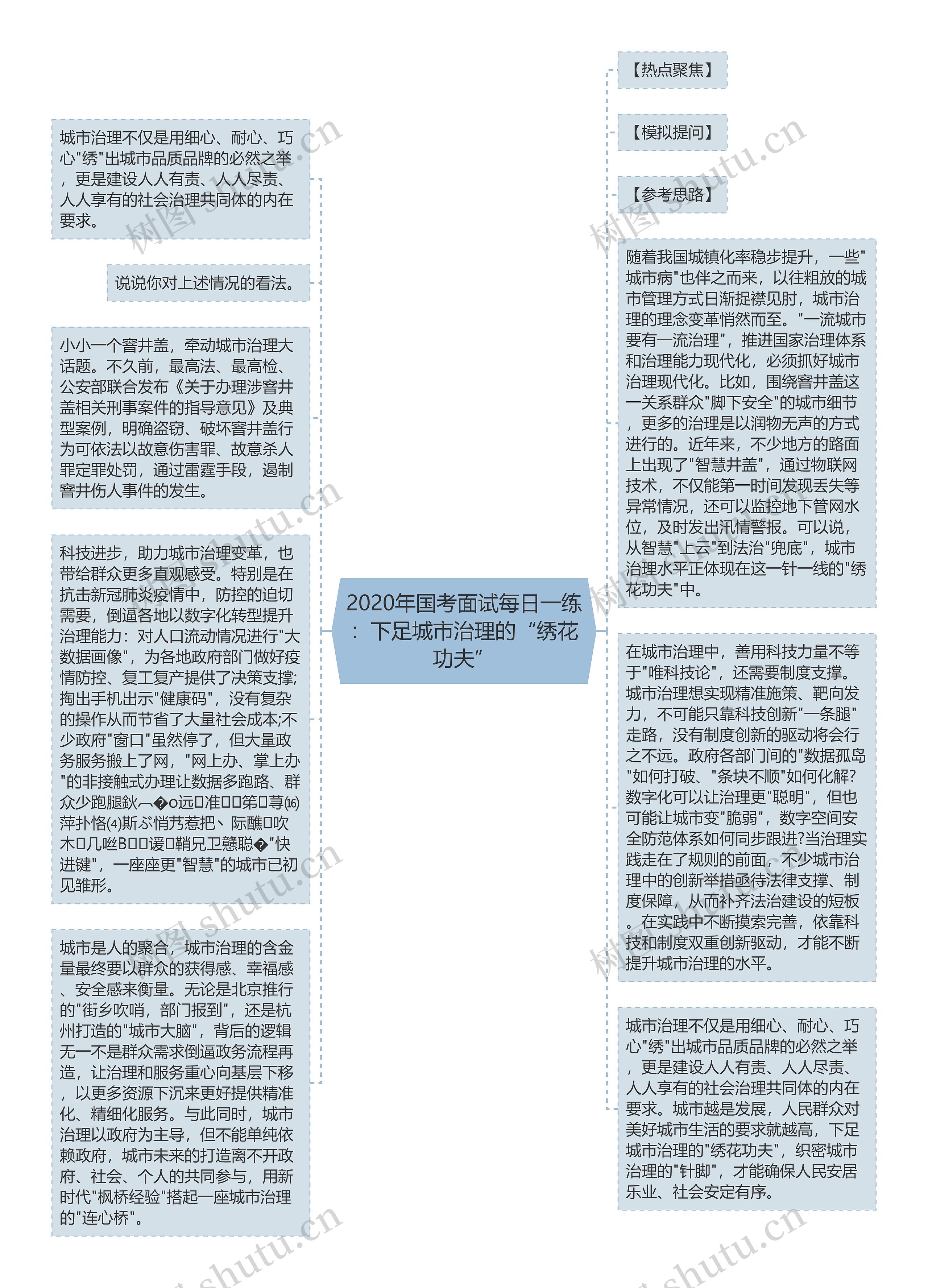树图思维导图提供《2020年国考面试每日一练:下足城市治理的“绣花功夫”》在线思维导图免费制作,点击“编辑”按钮,可对《2020年国考面试每日一练:下足城市治理的“绣花功夫”》进行在线思维导图编辑,本思维导图属于思维导图模板主题,文件编号是:c6248456ac1d2d4692d061658efafcf8