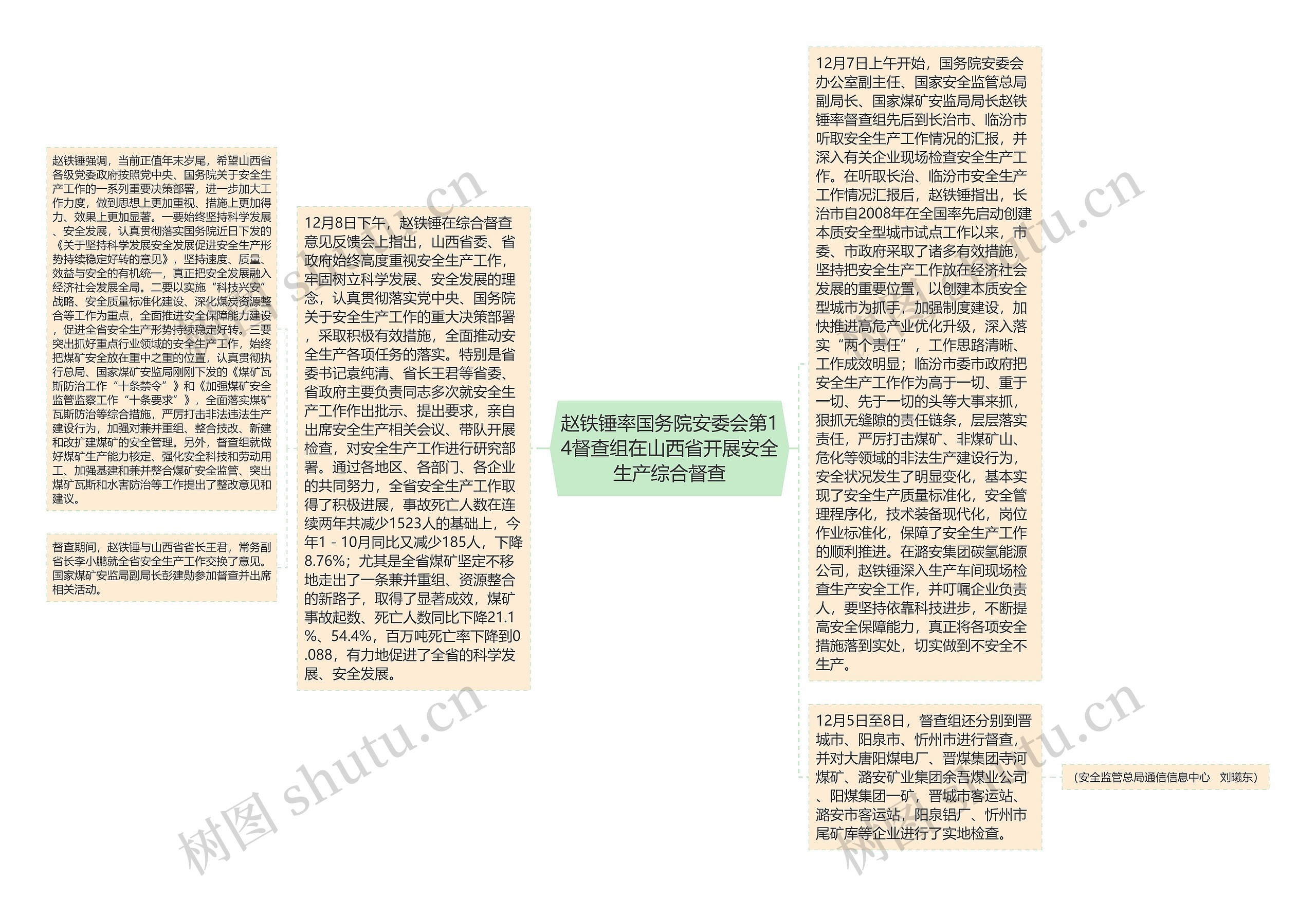 树图思维导图提供《赵铁锤率国务院安委会第14督查组在山西省开展安全生产综合督查》在线思维导图免费制作,点击“编辑”按钮,可对《赵铁锤率国务院安委会第14督查组在山西省开展安全生产综合督查》进行在线思维导图编辑,本思维导图属于思维导图模板主题,文件编号是:2ce6bb63030753b7e39f56bdfaea2a6d