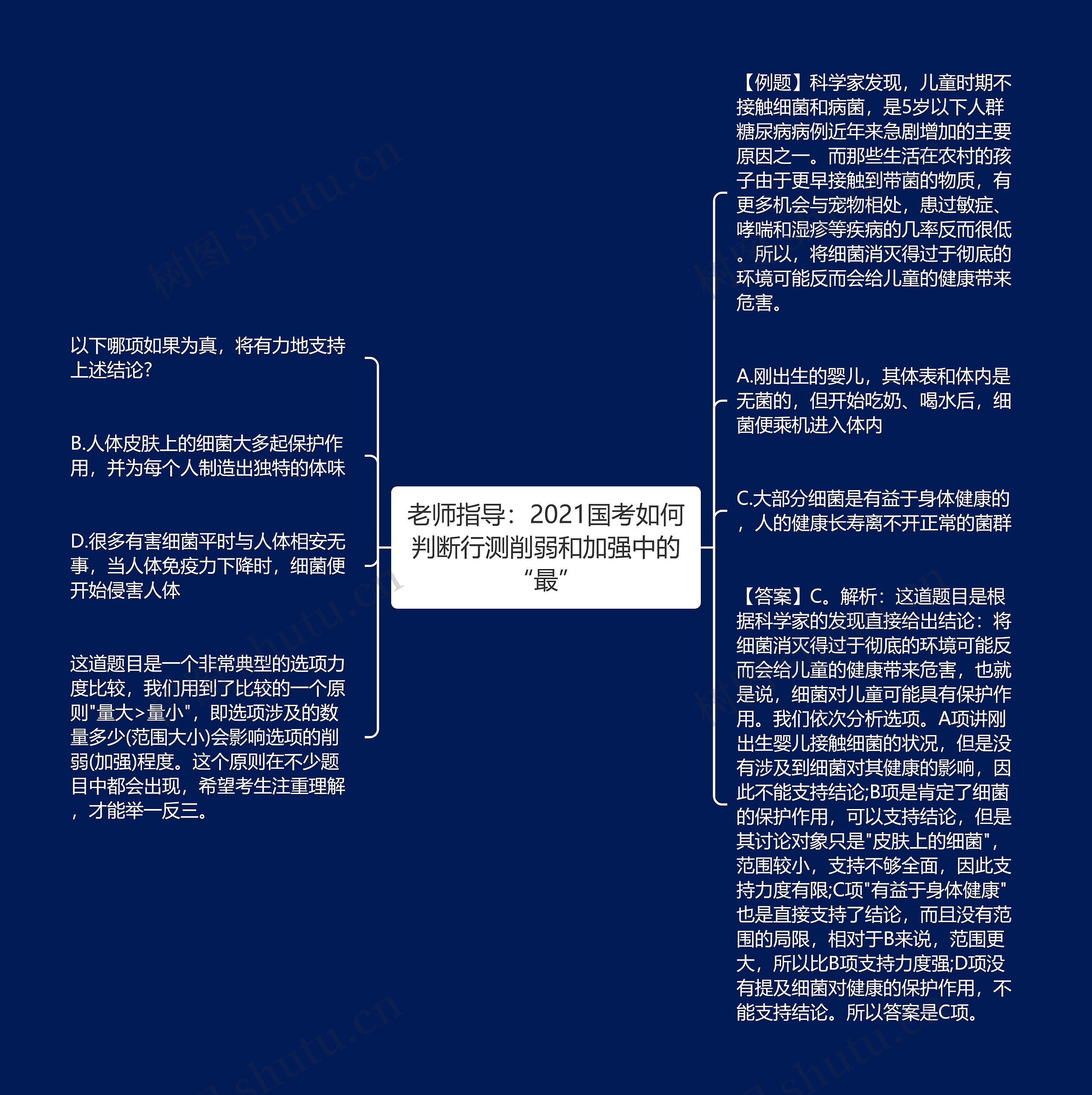 【答案】C。解析:这道题目是根据科学家的发现直接给出结论:将细菌消灭得过于彻底的环境可能反而会给儿童的健康带来危害,也就是说,细菌对儿童可能具有保护作用。我们依次分析选项。A项讲刚出生婴儿接触细菌的状况,但是没有涉及到细菌对其健康的影响,因此不能支持结论;B项是肯定了细菌的保护作用,可以支持结论,但是其讨论对象只是"皮肤上的细菌",范围较小,支持不够全面,因此支持力度有限;C项"有益于身体健康"也是直接支持了结论,而且没有范围的局限,相对于B来说,范围更大,所以比B项支持力度强;D项没有提及细菌对健康的保护作用,不能支持结论。所以答案是C项。