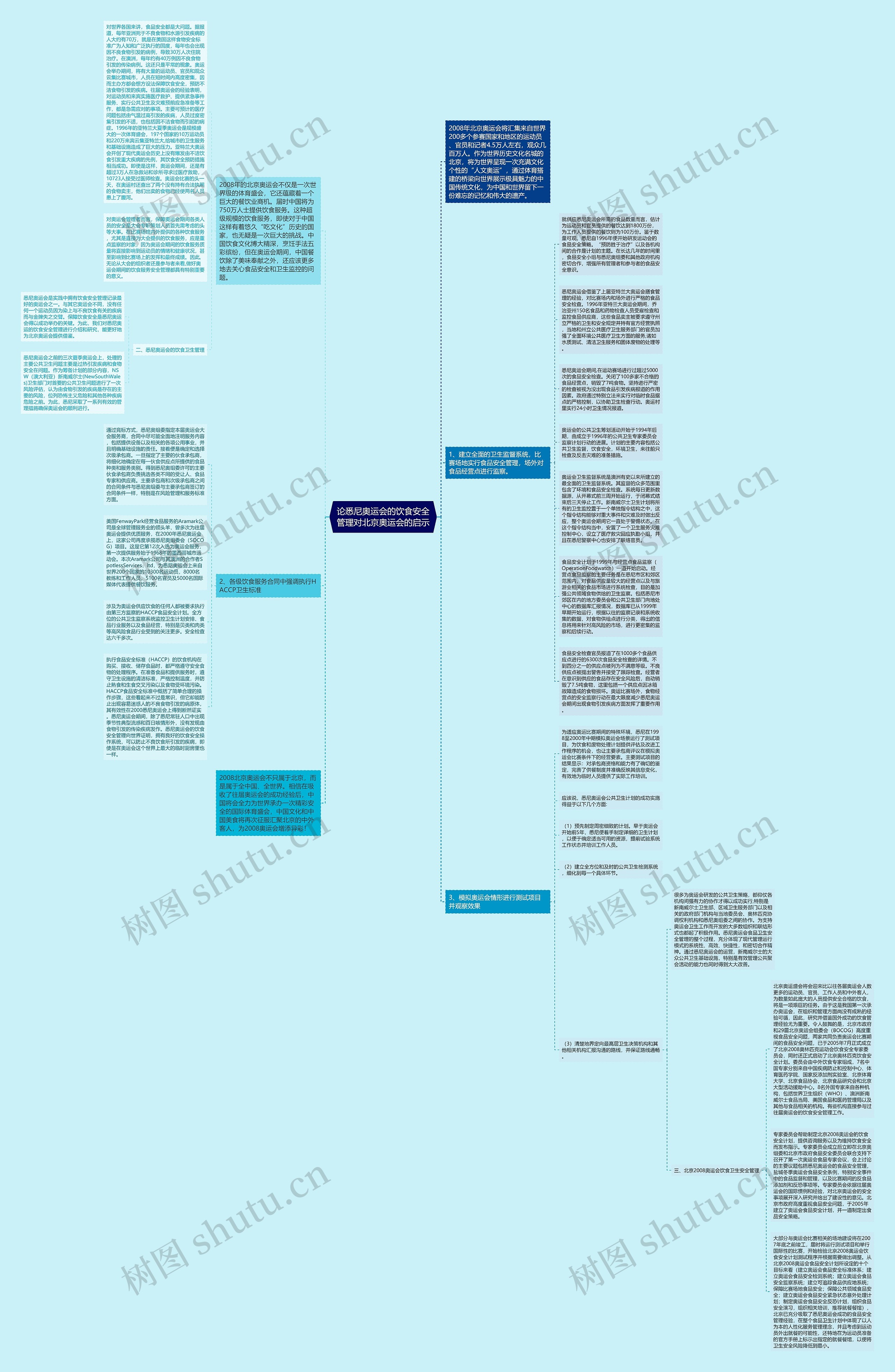 就供应悉尼奥运会所需的食品数量而言,估计为运动员和官员提供的餐饮达到1800万份,为工作人员提供的餐饮则为100万份。鉴于数量可观,悉尼自1996年便开始研发运动会的食品安全策略。“预防胜于治疗”以及各机构间的合作是计划的主题。在长达几年的时间里,食品安全小组与悉尼奥组委和其他政府机构密切合作,增强所有管理者和参与者的食品安全意识。