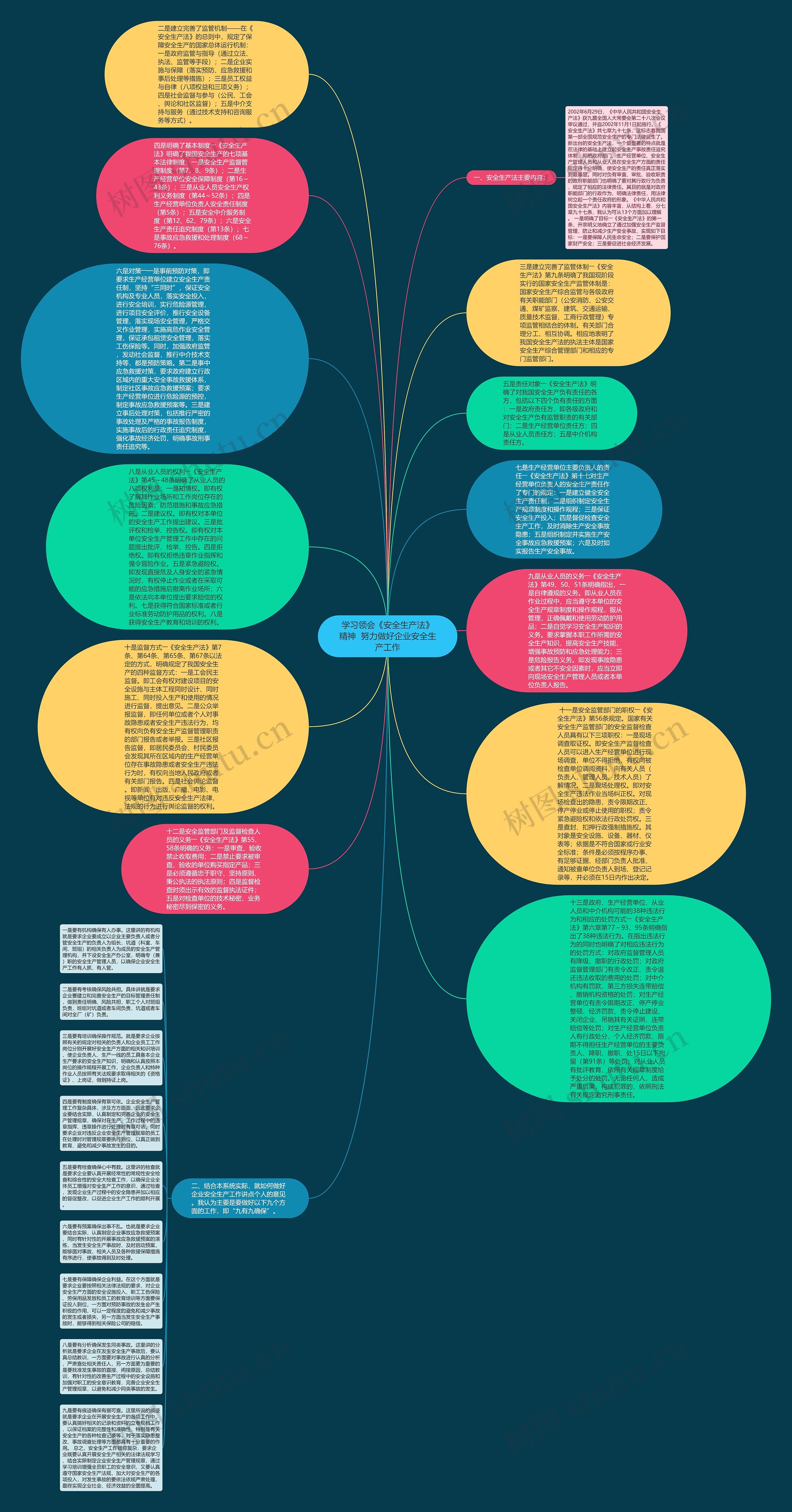 2002年6月29日,《中华人民共和国安全生产法》获九届全国人大常委会第二十八次会议审议通过,并自2002年11月1日起施行。《安全生产法》共七章九十七条,这标志着我国第一部全国规范安全生产的专门法律诞生了。新出台的安全生产法,一个最显著的特点就是在法律的基础上建立起安全生产事故责任追究体制,即把政府部门、生产经营单位、安全生产管理人员和从业人员在安全生产方面的责任规定得十分明确,使安全生产的责任真正落实到最基层。同时对负有审查、审批、验收职责的政府职能部门也明确了要对其行政行为负责,规定了相应的法律责任。其目的就是对政府职能部门的行政作为,明确法律责任,用法律树立起一个责任政府的形象。《中华人民共和国安全生产法》内容丰富,从结构上看,分七章九十七条,我认为可从13个方面加以理解。 一是明确了目标――《安全生产法》的第一条,开宗明义地确立了通过加强安全生产监督管理,防止和减少生产安全事故,实现如下目标:一是要保障人民生命安全;二是要保护国家财产安全;三是要促进社会经济发展。