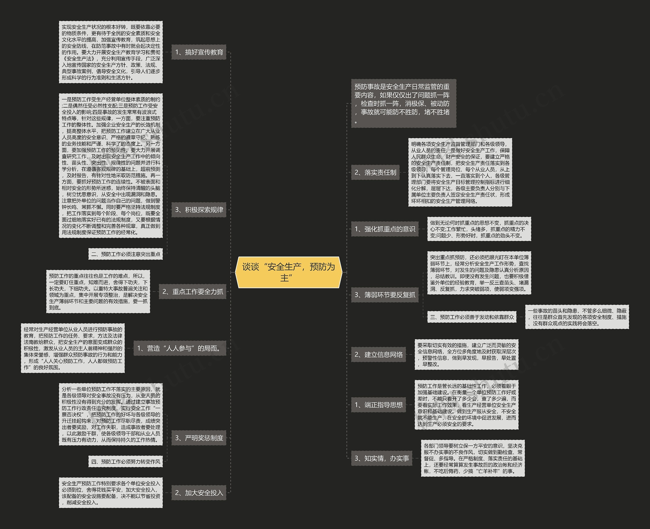 一是预防工作受生产经营单位整体素质的制约;二是偶然任受必然性支配;三是预防工作受安全投入的影响;四是事故的发生常常有波浪式特点等,针对这些规律,一方面,要注重预防工作的整体性。加强企业安全生产的长效机制,提高整体水平,把预防工作建立在广大从业人员高度的安全意识、严格的遵章守纪、熟练的业务技能和严谨、科学了的态度上。另一方面,要加强预防工作的预见性。要大力开展调查研究工作,及时出现安全生产工作中的倾向性、苗头性、突出性、规律性的问题并进行科学分析,在遵循客观规律的基础上,超前预测,及时报告,有针对性地采取防范措施。再一方面,要抓好预防工作的连续性。不被表面和相对安全的形势所迷惑,始终保持清醒的头脑,树立忧患意识,从安全中出现漏洞和隐患。注意把外单位的问题当作自己的问题,做到警钟长鸣、常抓不懈。同时要严格坚持法规制度,把工作落实到每个阶段、每个岗位,既要全面过细地落实好已有的法规制度,又要根据情况的变化不断调整和完善各种规章,真正做到用法规制度保证预防工作的经常化。