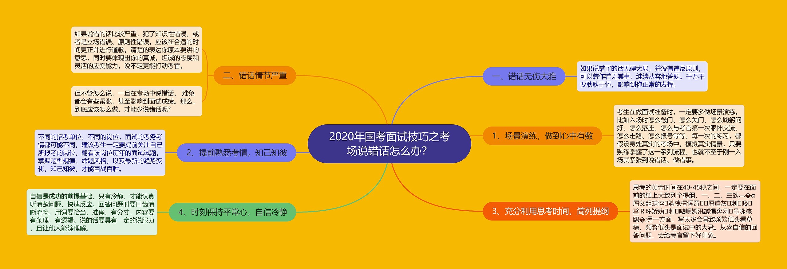 树图思维导图提供《2020年国考面试技巧之考场说错话怎么办?》在线思维导图免费制作,点击“编辑”按钮,可对《2020年国考面试技巧之考场说错话怎么办?》进行在线思维导图编辑,本思维导图属于思维导图模板主题,文件编号是:20c045e00d7b86aa178196768be06bcd