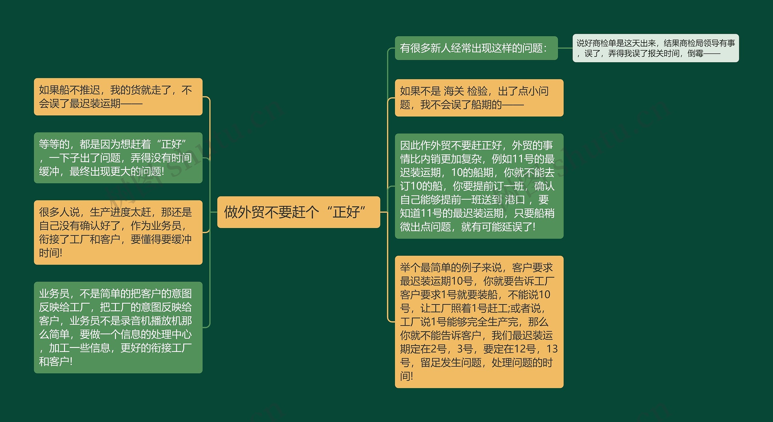 举个最简单的例子来说,客户要求最迟装运期10号,你就要告诉工厂客户要求1号就要装船,不能说10号,让工厂照着1号赶工;或者说,工厂说1号能够完全生产完,那么你就不能告诉客户,我们最迟装运期定在2号,3号,要定在12号,13号,留足发生问题,处理问题的时间!