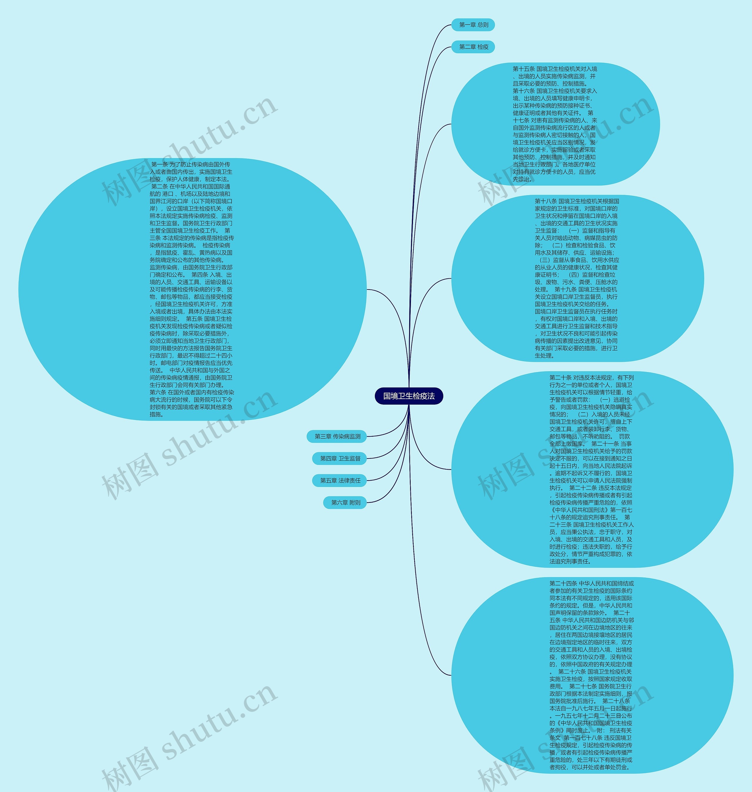 第一条 为了防止传染病由国外传入或者由国内传出,实施国境卫生检疫,保护人体健康,制定本法。 第二条 在中华人民共和国国际通航的 港口 、机场以及陆地边境和国界江河的口岸(以下简称国境口岸),设立国境卫生检疫机关,依照本法规定实施传染病检疫、监测和卫生监督。国务院卫生行政部门主管全国国境卫生检疫工作。 第三条 本法规定的传染病是指检疫传染病和监测传染病。 检疫传染病,是指鼠疫、霍乱、黄热病以及国务院确定和公布的其他传染病。 监测传染病,由国务院卫生行政部门确定和公布。 第四条 入境、出境的人员、交通工具、运输设备以及可能传播检疫传染病的行李、货物、邮包等物品,都应当接受检疫,经国境卫生检疫机关许可,方准入境或者出境,具体办法由本法实施细则规定。 第五条 国境卫生检疫机关发现检疫传染病或者疑似检疫传染病时,除采取必要措施外,必须立即通知当地卫生行政部门,同时用最快的方法报告国务院卫生行政部门,最迟不得超过二十四小时。邮电部门对疫情报告应当优先传送。 中华人民共和国与外国之间的传染病疫情通报,由国务院卫生行政部门会同有关部门办理。 第六条 在国外或者国内有检疫传染病大流行的时候,国务院可以下令封锁有关的国境或者采取其他紧急措施。
