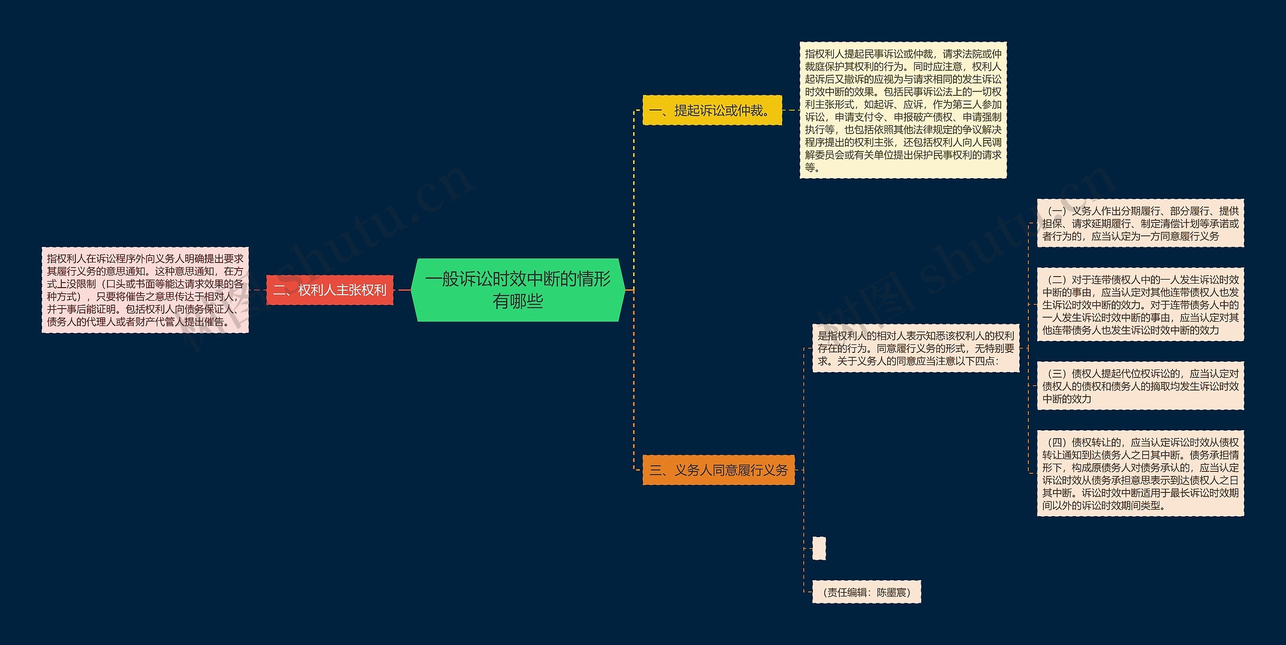 树图思维导图提供《一般诉讼时效中断的情形有哪些》在线思维导图免费制作,点击“编辑”按钮,可对《一般诉讼时效中断的情形有哪些》进行在线思维导图编辑,本思维导图属于思维导图模板主题,文件编号是:1d513a15fd944db30f9763c441b38239