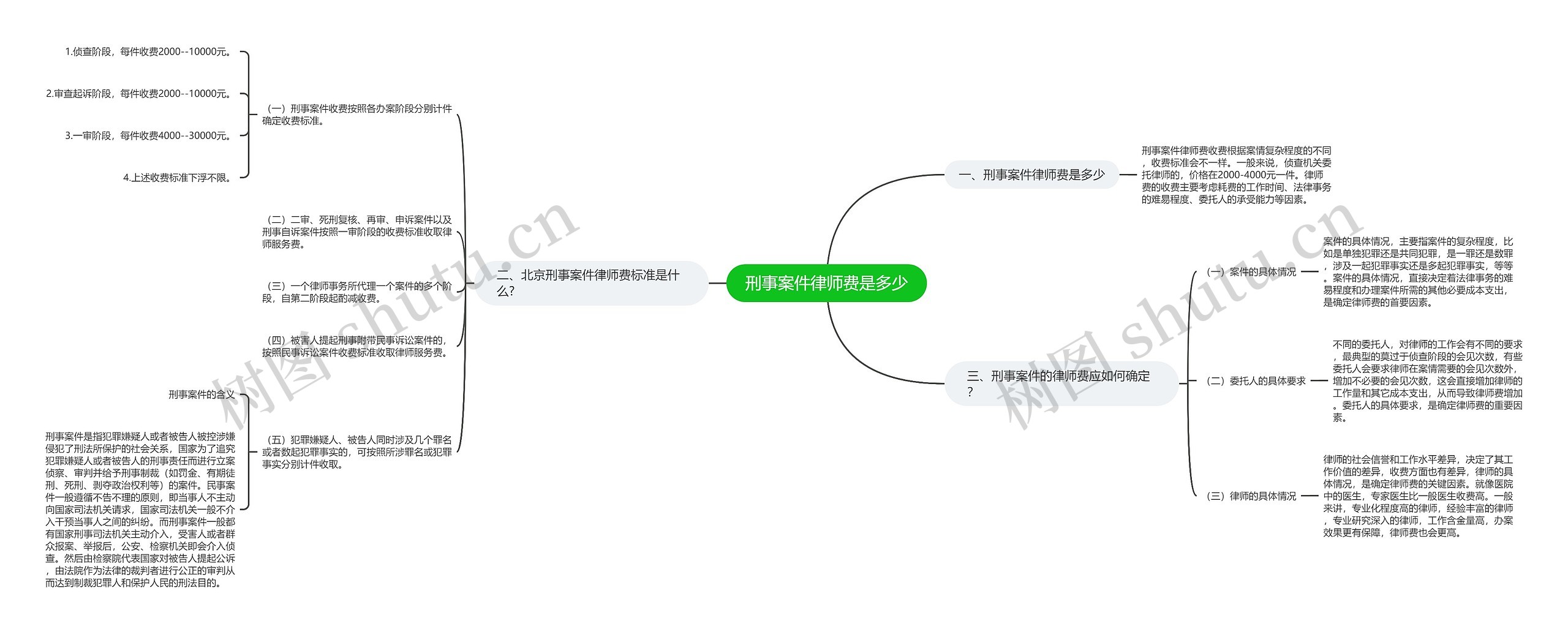 树图思维导图提供《刑事案件律师费是多少》在线思维导图免费制作,点击“编辑”按钮,可对《刑事案件律师费是多少》进行在线思维导图编辑,本思维导图属于思维导图模板主题,文件编号是:758e1f5d1df781f429971bea517a79d0