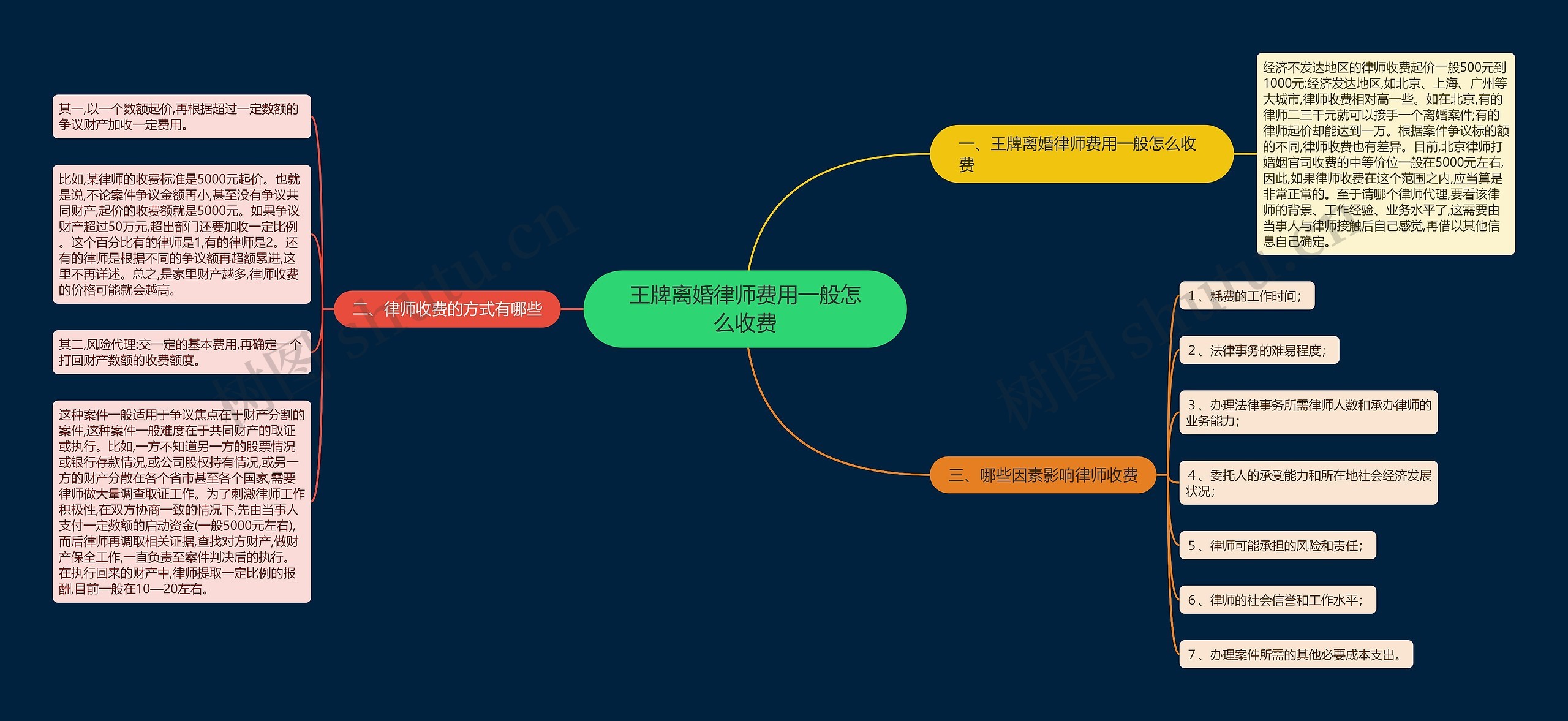 树图思维导图提供《王牌离婚律师费用一般怎么收费》在线思维导图免费制作,点击“编辑”按钮,可对《王牌离婚律师费用一般怎么收费》进行在线思维导图编辑,本思维导图属于思维导图模板主题,文件编号是:a8356654f0947a2de8de4629d704d903