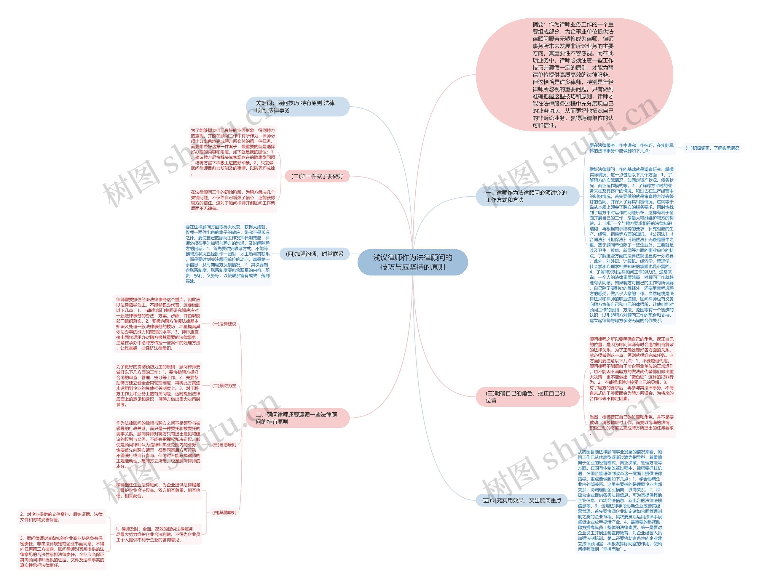 做好法律顾问工作的基础就是调查研究、掌握实际情况。这一点包括以下几个方面:1、了解聘方的实际情况,如固定资产状况、债务状况、商业运作模式等。2、了解聘方平时的业务来往及其客户的情况,和过去在生产经营中的纠纷情况。首先要做的就是审查聘方过去签订的合同,并深入了解其纠纷情况。这就等于说从本质上领会了聘方的服务要求,同时也找到了聘方平时运作的问题所在,这样有利于全面开展自己的工作,尽最大可能维护聘方的利益。3、制订一个与聘方要求相符的法律知识结构,再根据知识结构的要求,补充相应的生产、经营、销售等方面的知识。《公司法》《合同法》《担保法》《赔偿法》无疑是重中之重,鉴于顾问单位除了一些企业外,主要就是涉及卫生、教育、新闻等方面的事业单位的特点,了解这些方面的法律法规也显得十分必要。此外,对外语、计算机、经济学、管理学、社会学和心理学相关知识的掌握也是必需的。4、了解聘方对法律顾问工作的认识。通常来说,一个人的法律素质越高,对顾问工作就越能有认同感。如果聘方对自己的工作有所误解,自己除了要耐心的解释外,还要尽量考虑聘方的感受,做合乎人意的工作。当然底线是法律法规和律师的职业道德。顾问律师也有义务向聘方宣传自己和自己的律师所,让他们能对顾问工作的原则、方法、范围等有一个初步的认识,以引起聘方对顾问工作的配合和支持,建立起律师与聘方亲密无间的合作关系。