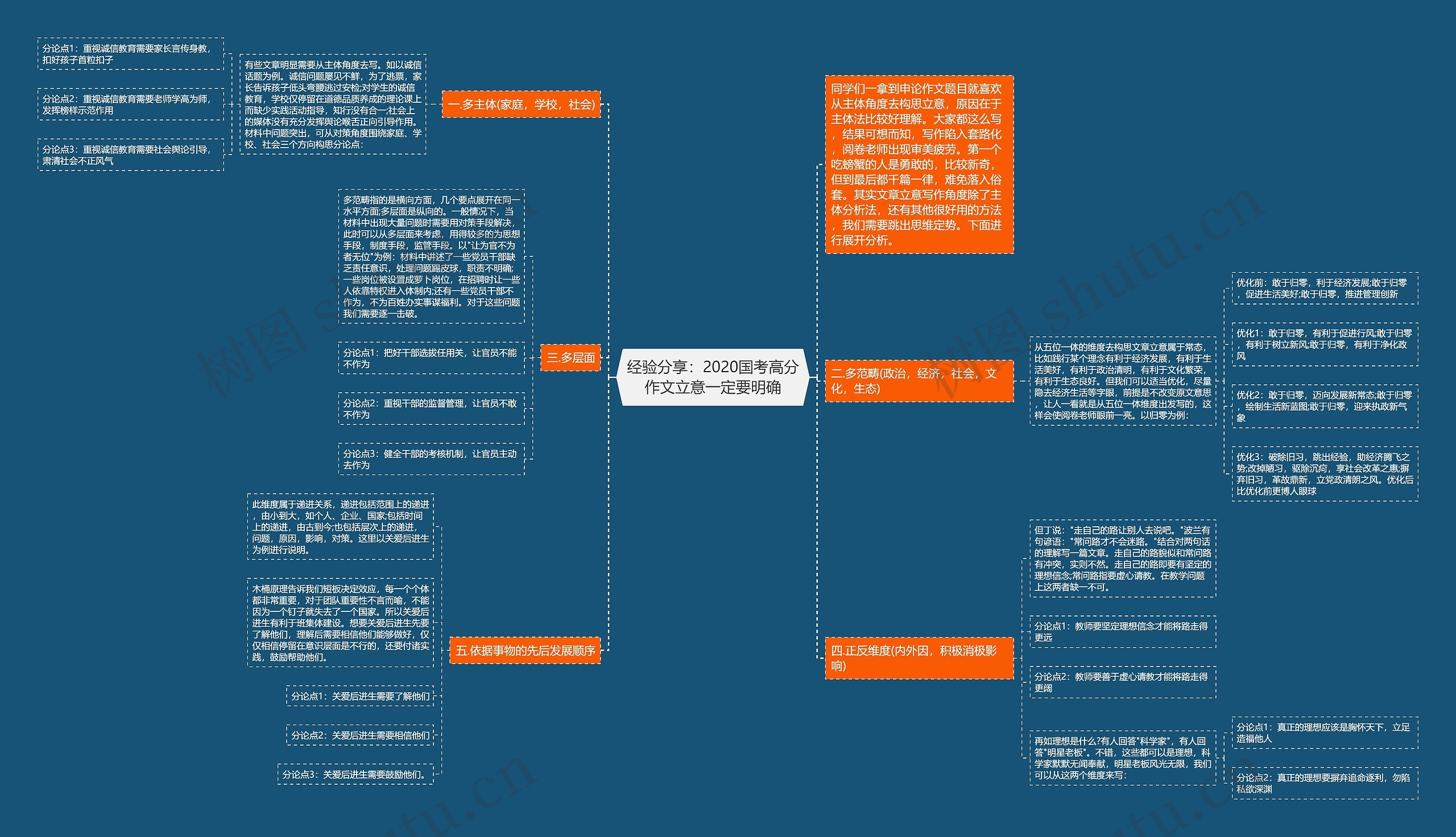 树图思维导图提供《经验分享:2020国考高分作文立意一定要明确》在线思维导图免费制作,点击“编辑”按钮,可对《经验分享:2020国考高分作文立意一定要明确》进行在线思维导图编辑,本思维导图属于思维导图模板主题,文件编号是:dfcd7e75f34ff859e85984edf184c16d