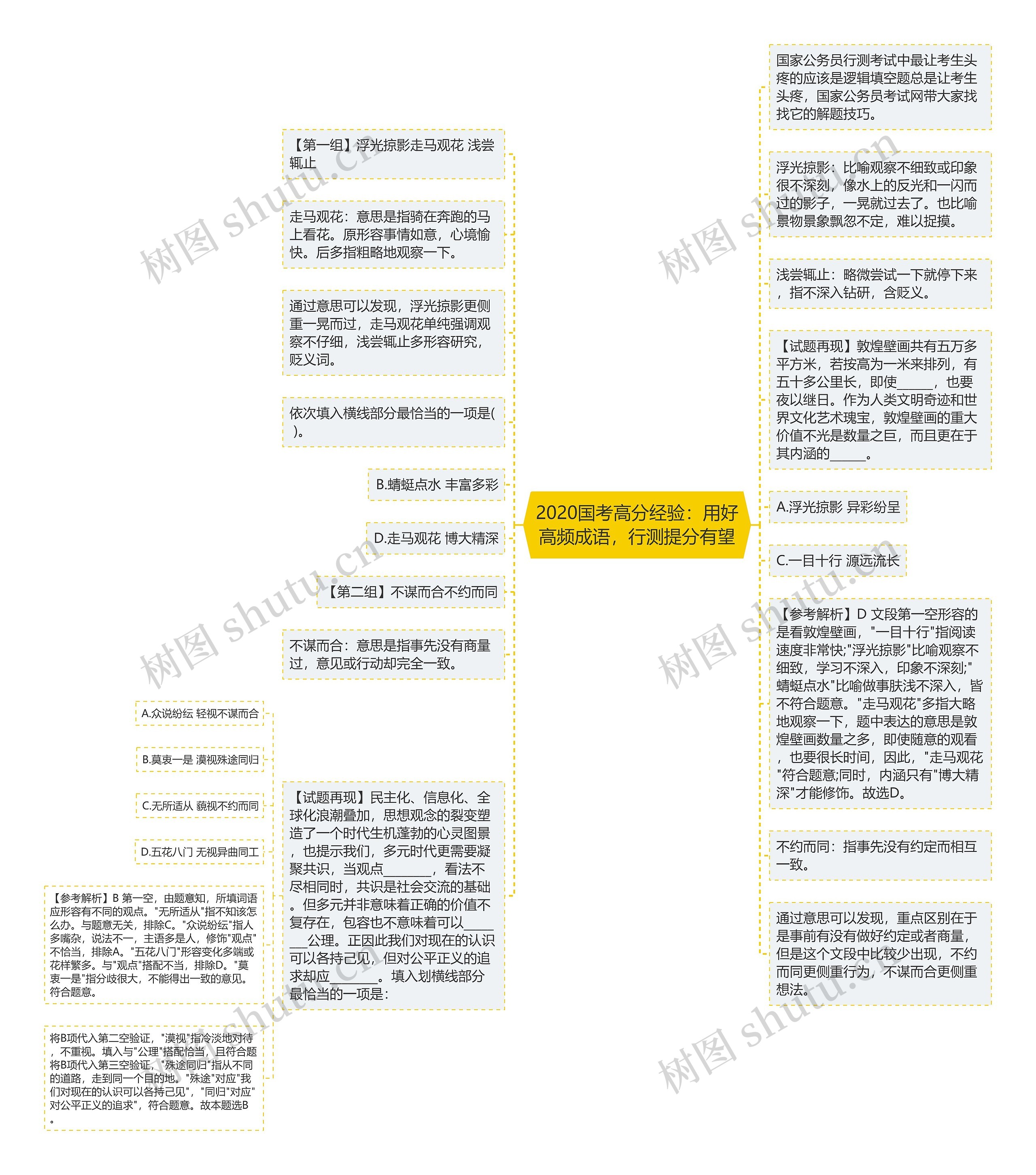 【参考解析】D 文段第一空形容的是看敦煌壁画,"一目十行"指阅读速度非常快;"浮光掠影"比喻观察不细致,学习不深入,印象不深刻;"蜻蜓点水"比喻做事肤浅不深入,皆不符合题意。"走马观花"多指大略地观察一下,题中表达的意思是敦煌壁画数量之多,即使随意的观看,也要很长时间,因此,"走马观花"符合题意;同时,内涵只有"博大精深"才能修饰。故选D。
