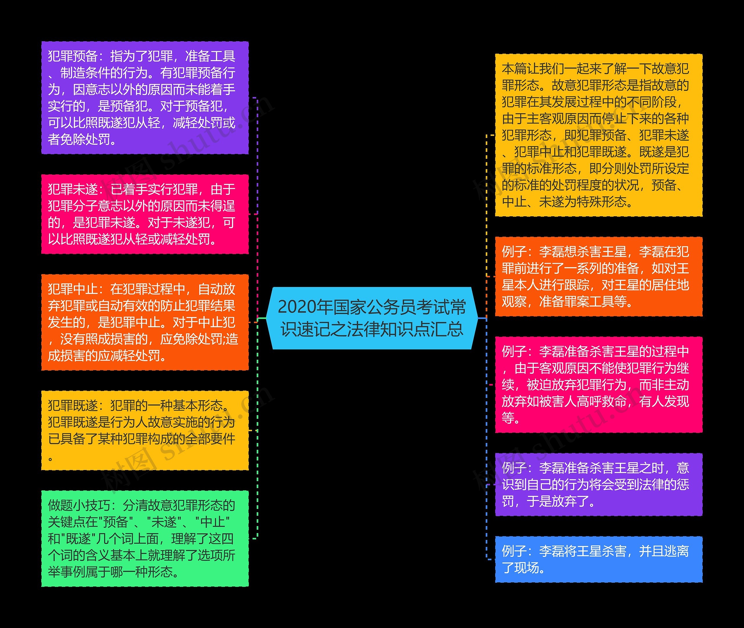 做题小技巧:分清故意犯罪形态的关键点在"预备"、"未遂"、"中止"和"既遂"几个词上面,理解了这四个词的含义基本上就理解了选项所举事例属于哪一种形态。