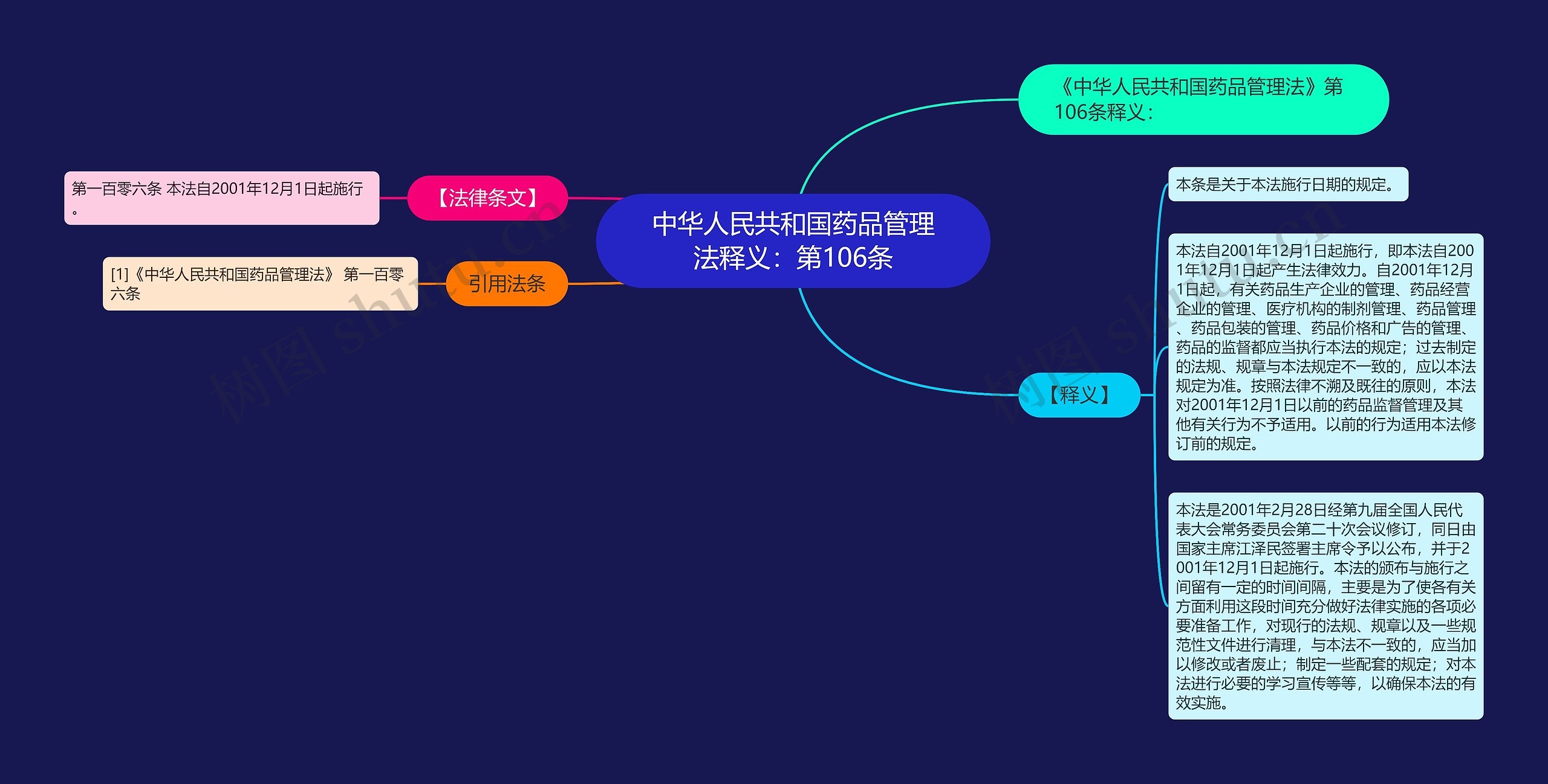 核心内容:《中华人民共和国药品管理法》第106条应该怎样释义呢?药品管理法第106条规定的是本法的施行日期,本法自2001年12月1日起施行。树图网编辑为您详细介绍关于药品管理法第106条的释义。