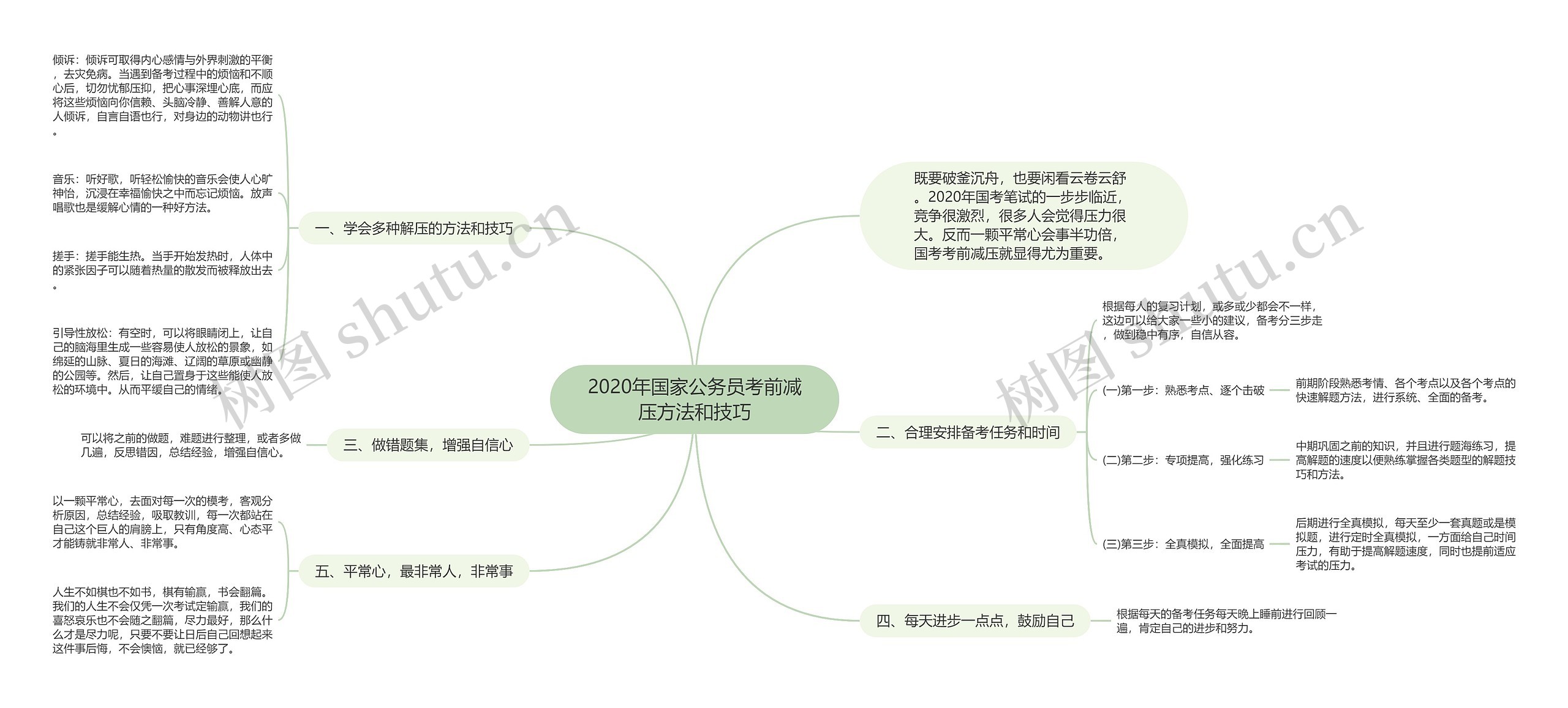 树图思维导图提供《2020年国家公务员考前减压方法和技巧》在线思维导图免费制作,点击“编辑”按钮,可对《2020年国家公务员考前减压方法和技巧》进行在线思维导图编辑,本思维导图属于思维导图模板主题,文件编号是:cee6ef8975ecf0377dca81da09f6b687