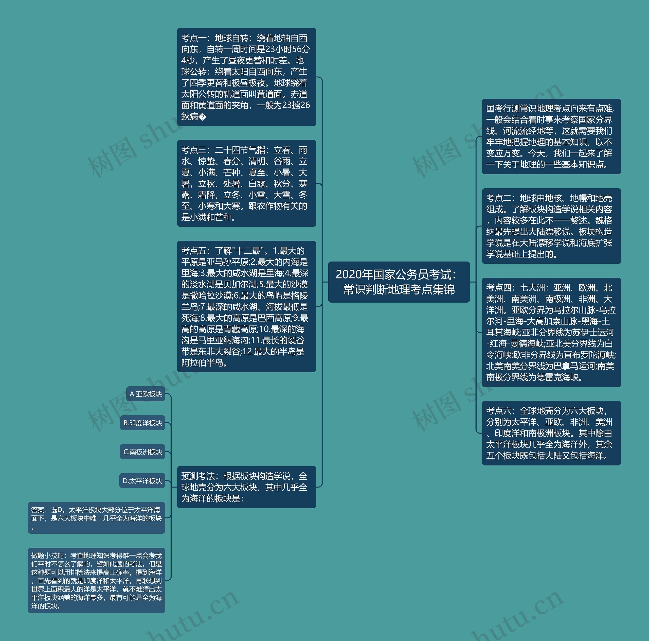 做题小技巧:考查地理知识考得难一点会考我们平时不怎么了解的,譬如此题的考法。但是这种题可以用排除法来提高正确率,提到海洋,首先看到的就是印度洋和太平洋,再联想到世界上面积最大的洋是太平洋,就不难猜出太平洋板块涵盖的海洋最多,最有可能是全为海洋的板块。
