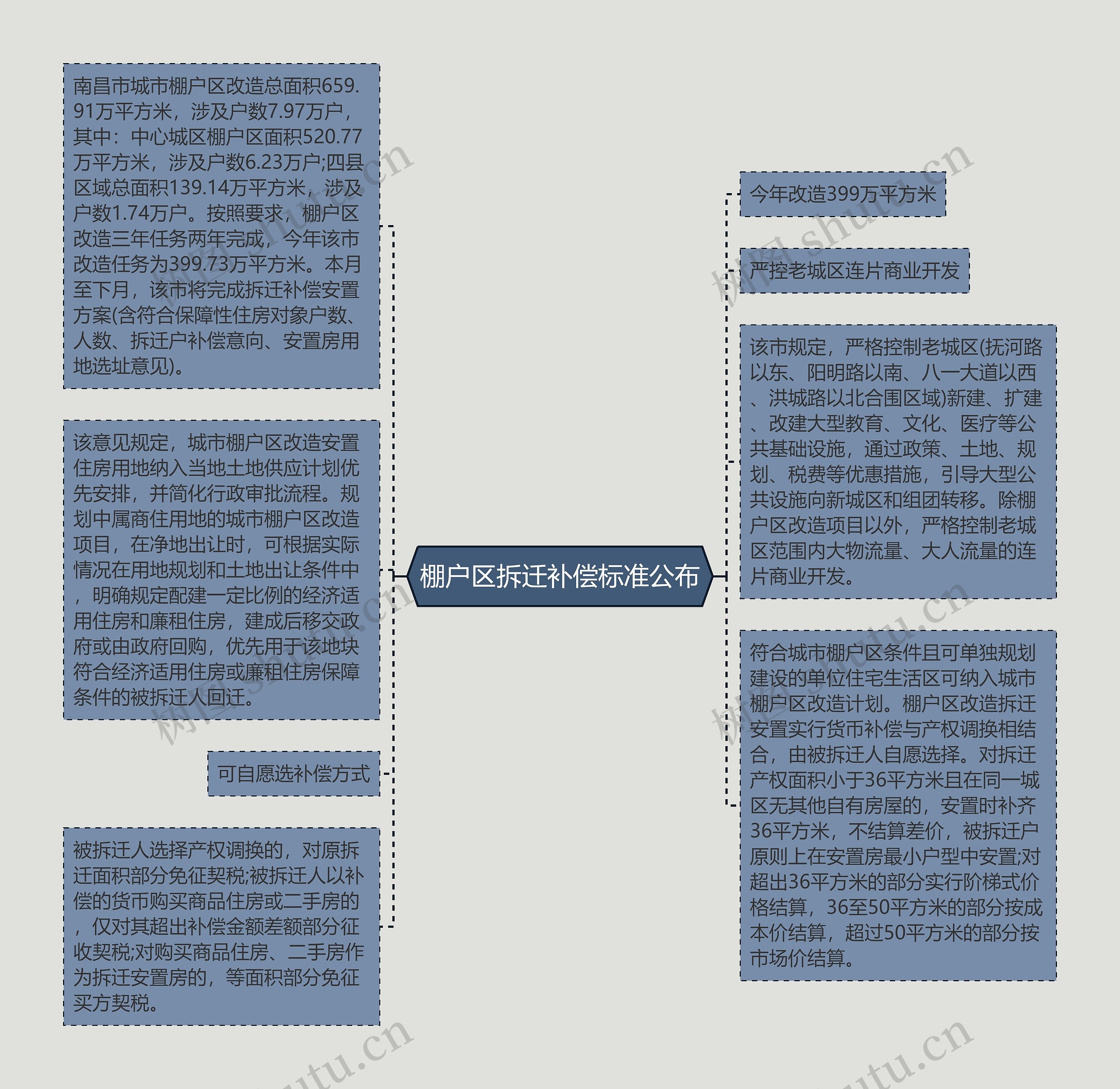 符合城市棚户区条件且可单独规划建设的单位住宅生活区可纳入城市棚户区改造计划。棚户区改造拆迁安置实行货币补偿与产权调换相结合,由被拆迁人自愿选择。对拆迁产权面积小于36平方米且在同一城区无其他自有房屋的,安置时补齐36平方米,不结算差价,被拆迁户原则上在安置房最小户型中安置;对超出36平方米的部分实行阶梯式价格结算,36至50平方米的部分按成本价结算,超过50平方米的部分按市场价结算。
