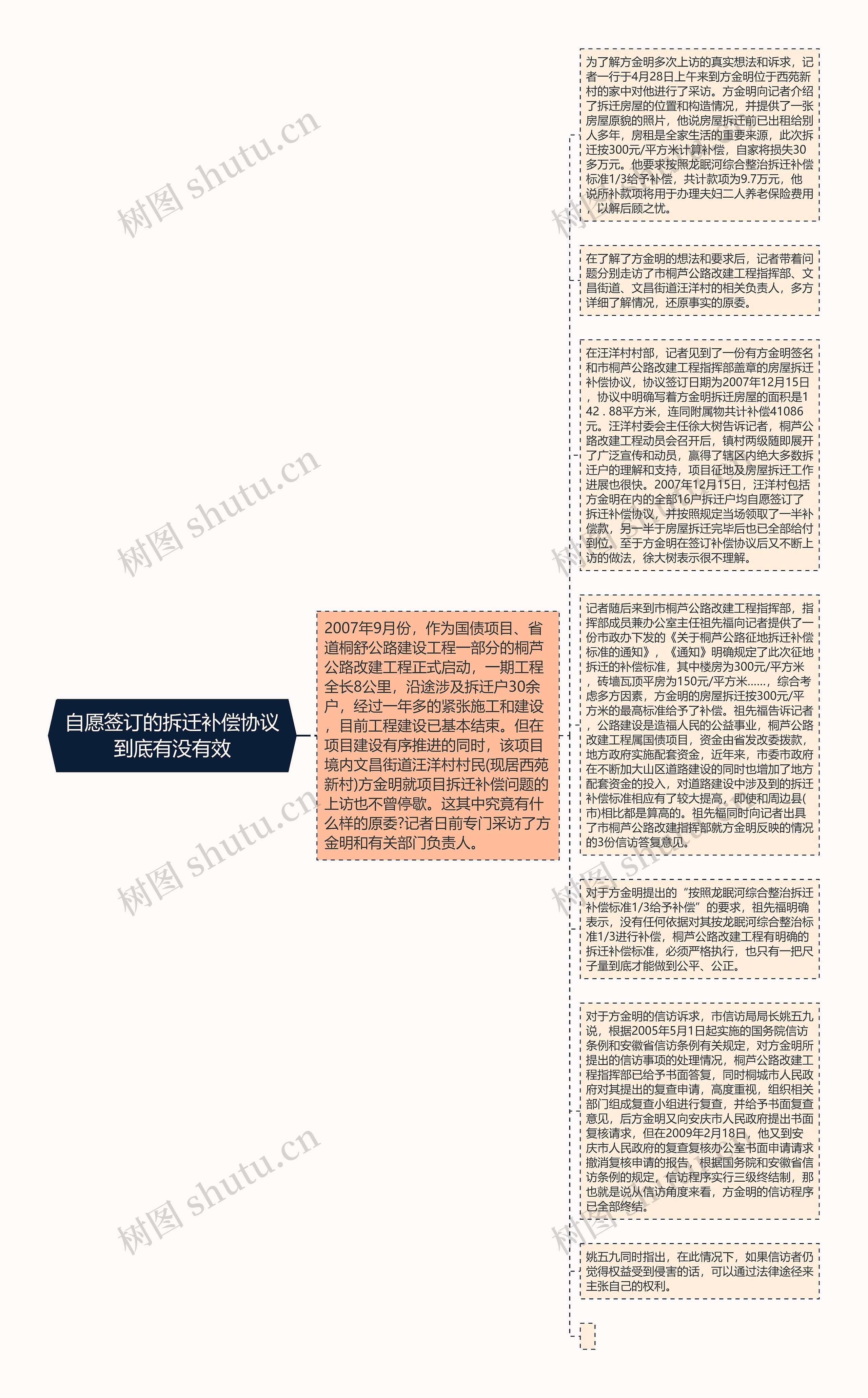 在汪洋村村部,记者见到了一份有方金明签名和市桐芦公路改建工程指挥部盖章的房屋拆迁补偿协议,协议签订日期为2007年12月15日,协议中明确写着方金明拆迁房屋的面积是142 . 88平方米,连同附属物共计补偿41086元。汪洋村委会主任徐大树告诉记者,桐芦公路改建工程动员会召开后,镇村两级随即展开了广泛宣传和动员,赢得了辖区内绝大多数拆迁户的理解和支持,项目征地及房屋拆迁工作进展也很快。2007年12月15日,汪洋村包括方金明在内的全部16户拆迁户均自愿签订了拆迁补偿协议,并按照规定当场领取了一半补偿款,另一半于房屋拆迁完毕后也已全部给付到位。至于方金明在签订补偿协议后又不断上访的做法,徐大树表示很不理解。
