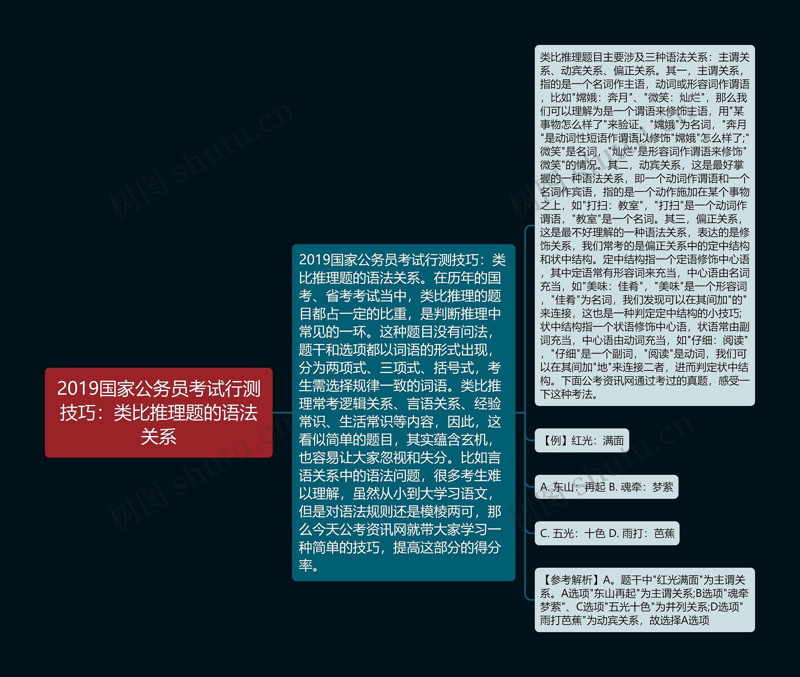 树图思维导图提供《2019国家公务员考试行测技巧:类比推理题的语法关系》在线思维导图免费制作,点击“编辑”按钮,可对《2019国家公务员考试行测技巧:类比推理题的语法关系》进行在线思维导图编辑,本思维导图属于思维导图模板主题,文件编号是:785728603dd6a7daf05891d2709ae1c7