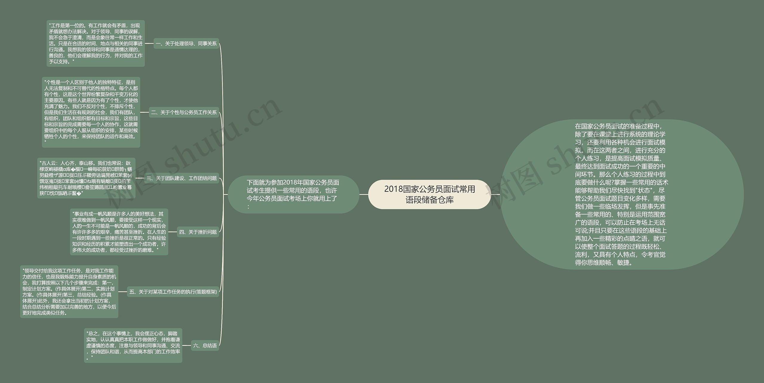 树图思维导图提供《2018国家公务员面试常用语段储备仓库》在线思维导图免费制作,点击“编辑”按钮,可对《2018国家公务员面试常用语段储备仓库》进行在线思维导图编辑,本思维导图属于思维导图模板主题,文件编号是:dd6ea06b8e23405658a5a8a85b617ce9