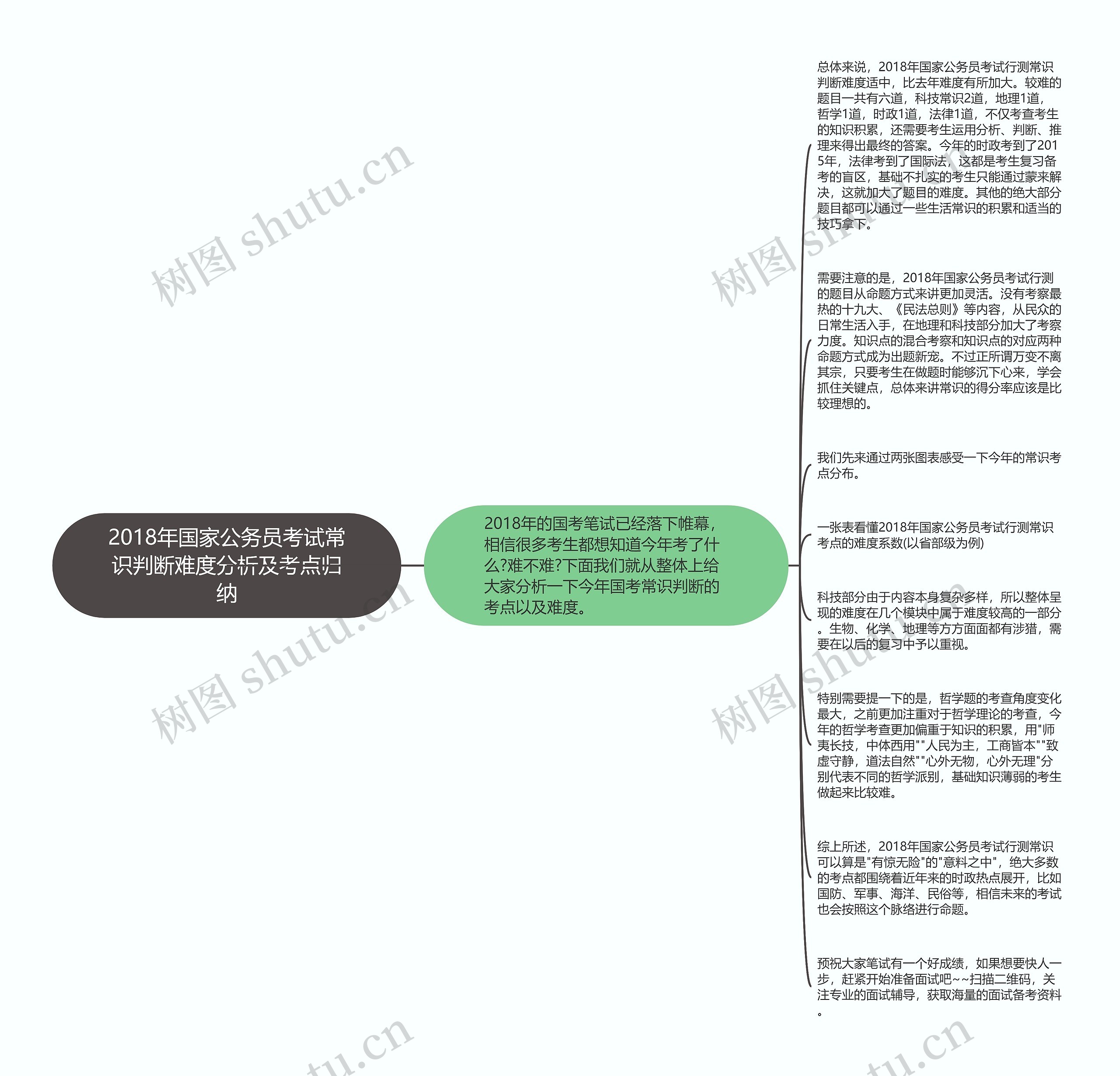 总体来说,2018年国家公务员考试行测常识判断难度适中,比去年难度有所加大。较难的题目一共有六道,科技常识2道,地理1道,哲学1道,时政1道,法律1道,不仅考查考生的知识积累,还需要考生运用分析、判断、推理来得出最终的答案。今年的时政考到了2015年,法律考到了国际法,这都是考生复习备考的盲区,基础不扎实的考生只能通过蒙来解决,这就加大了题目的难度。其他的绝大部分题目都可以通过一些生活常识的积累和适当的技巧拿下。