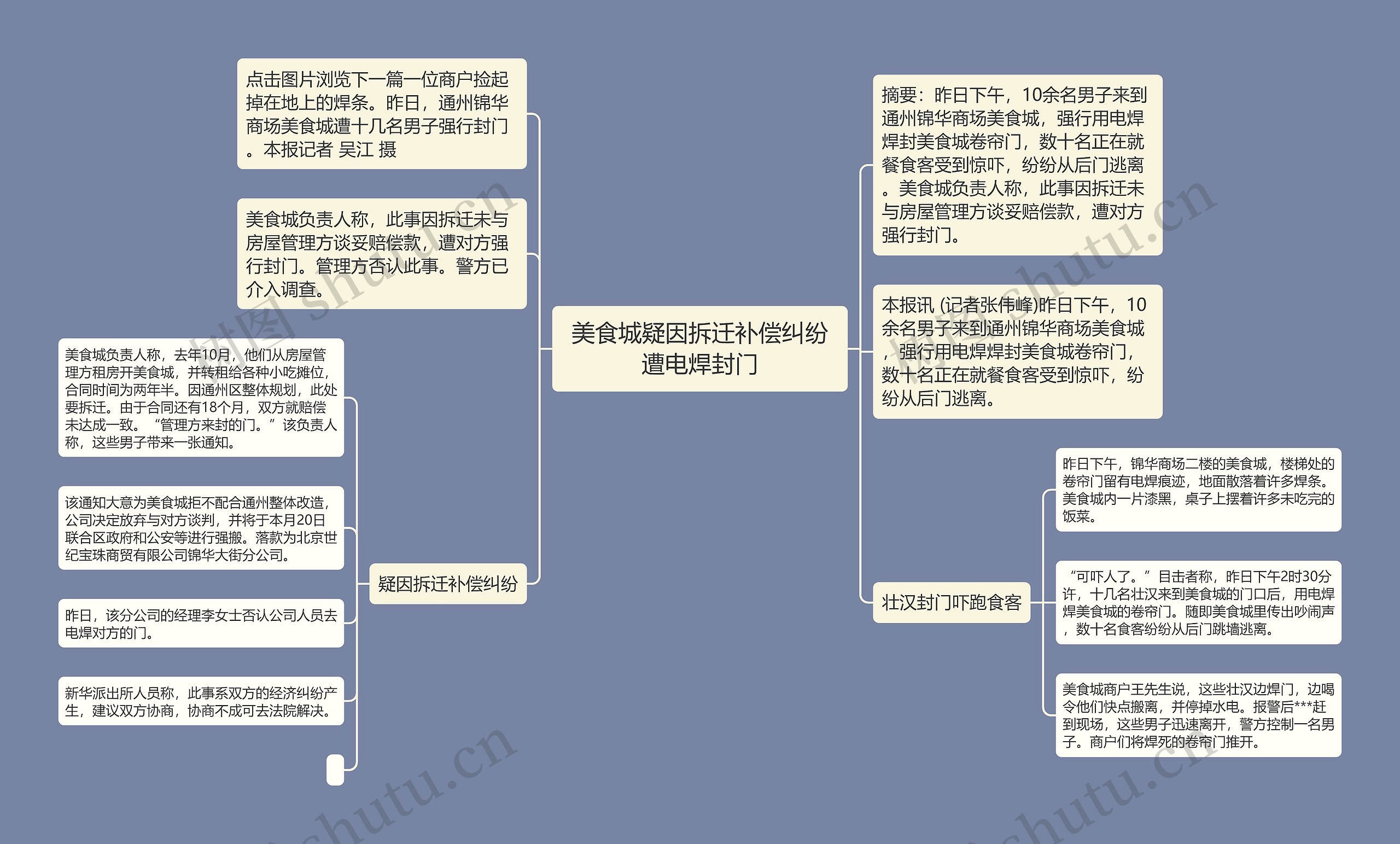 美食城负责人称,去年10月,他们从房屋管理方租房开美食城,并转租给各种小吃摊位,合同时间为两年半。因通州区整体规划,此处要拆迁。由于合同还有18个月,双方就赔偿未达成一致。“管理方来封的门。”该负责人称,这些男子带来一张通知。