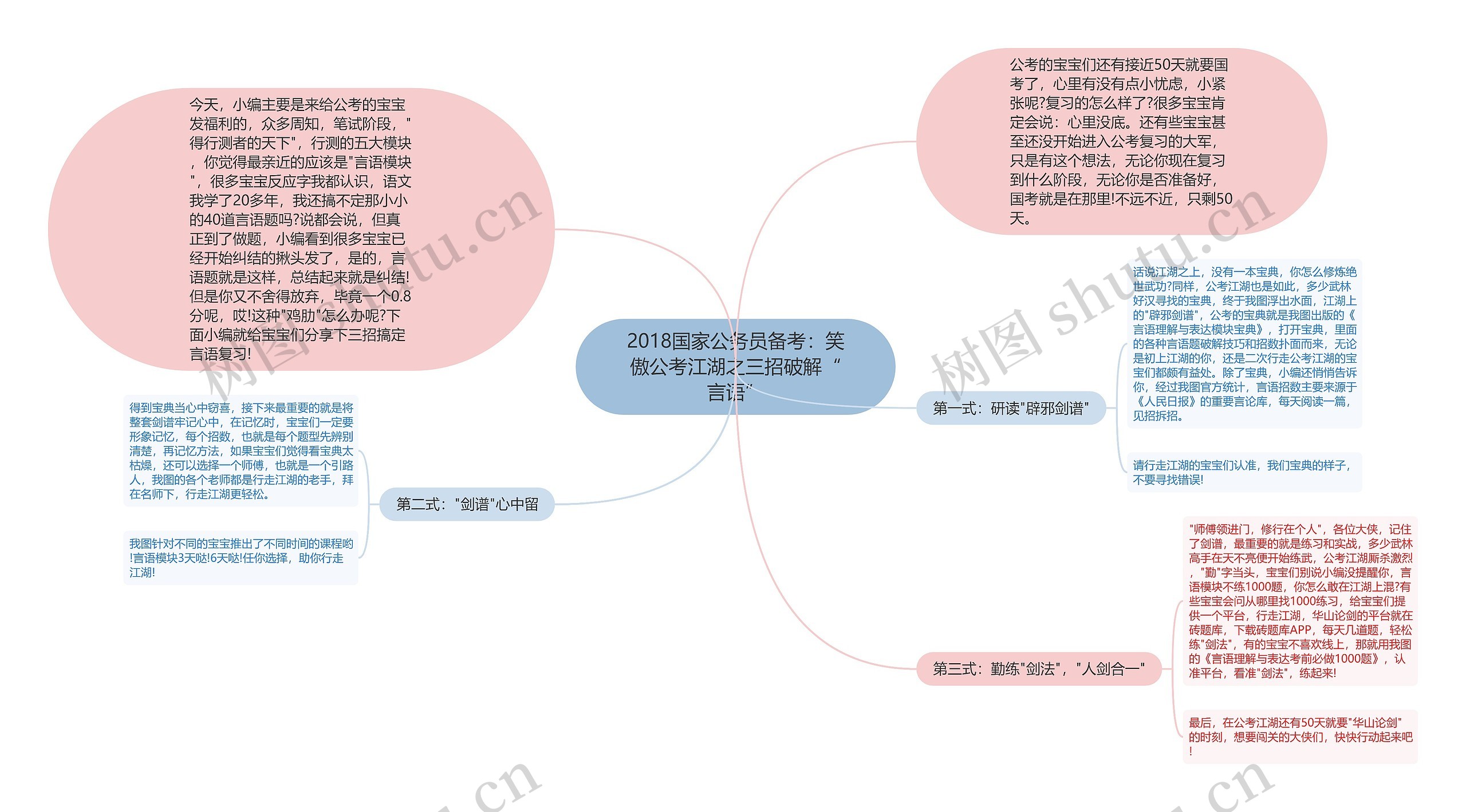 树图思维导图提供《2018国家公务员备考:笑傲公考江湖之三招破解“言语”》在线思维导图免费制作,点击“编辑”按钮,可对《2018国家公务员备考:笑傲公考江湖之三招破解“言语”》进行在线思维导图编辑,本思维导图属于思维导图模板主题,文件编号是:75aa407e86073e19ee182f6b1a8c2fae