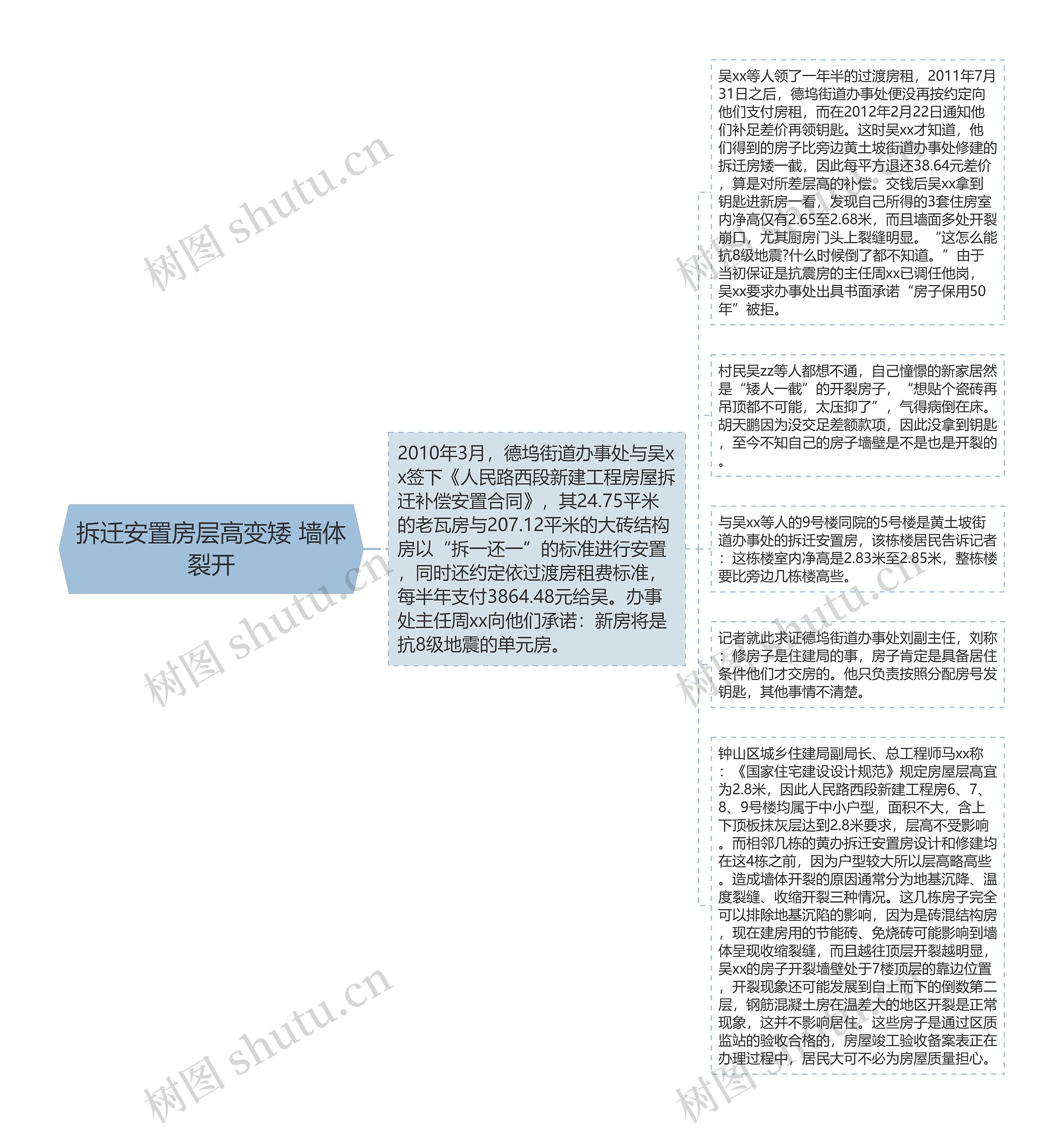 吴xx等人领了一年半的过渡房租,2011年7月31日之后,德坞街道办事处便没再按约定向他们支付房租,而在2012年2月22日通知他们补足差价再领钥匙。这时吴xx才知道,他们得到的房子比旁边黄土坡街道办事处修建的拆迁房矮一截,因此每平方退还38.64元差价,算是对所差层高的补偿。交钱后吴xx拿到钥匙进新房一看,发现自己所得的3套住房室内净高仅有2.65至2.68米,而且墙面多处开裂崩口,尤其厨房门头上裂缝明显。“这怎么能抗8级地震?什么时候倒了都不知道。”由于当初保证是抗震房的主任周xx已调任他岗,吴xx要求办事处出具书面承诺“房子保用50年”被拒。