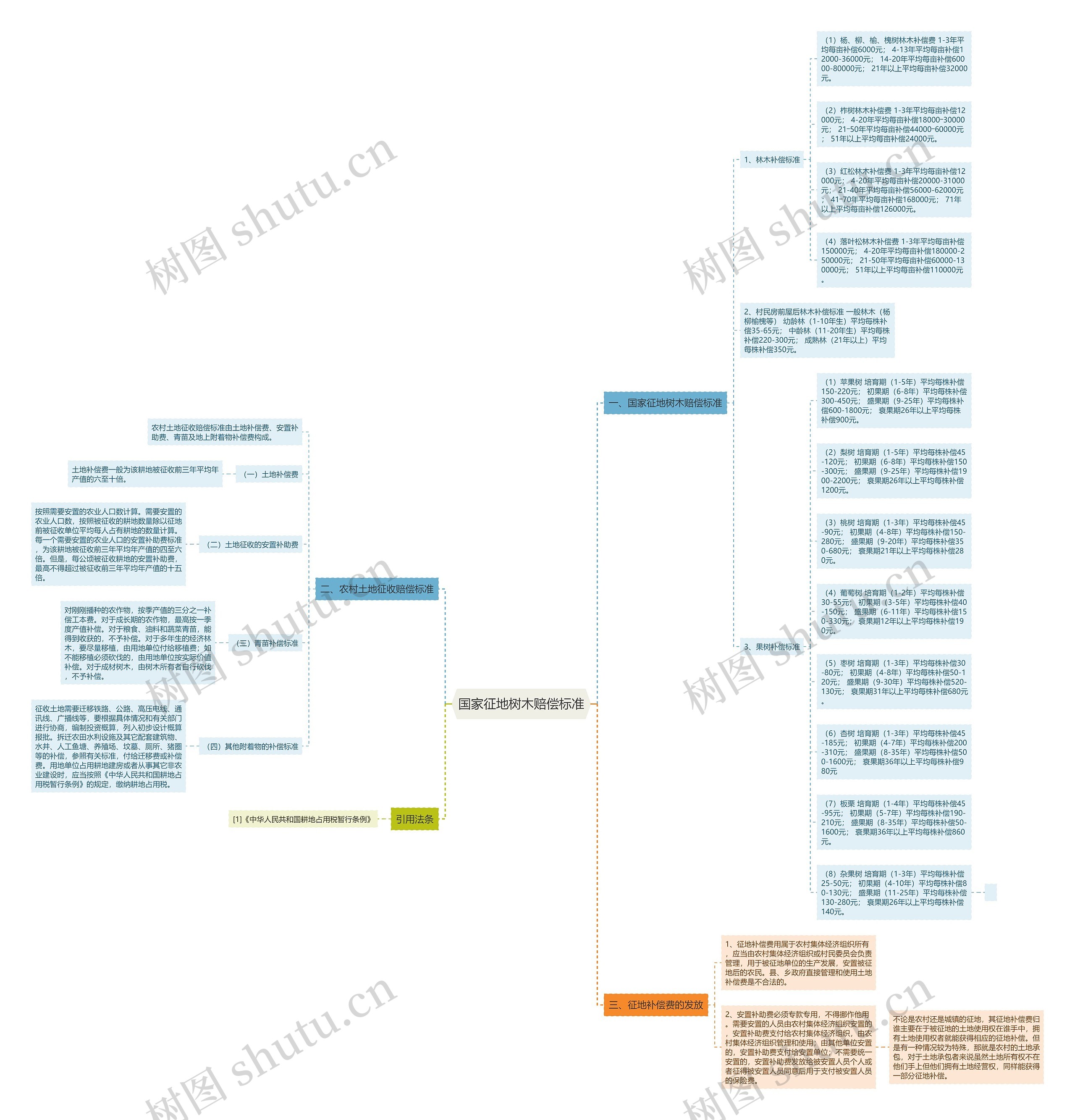 (6)杏树 培育期(1-3年)平均每株补偿45-185元; 初果期(4-7年)平均每株补偿200-310元; 盛果期(8-35年)平均每株补偿500-1600元; 衰果期36年以上平均每株补偿980元