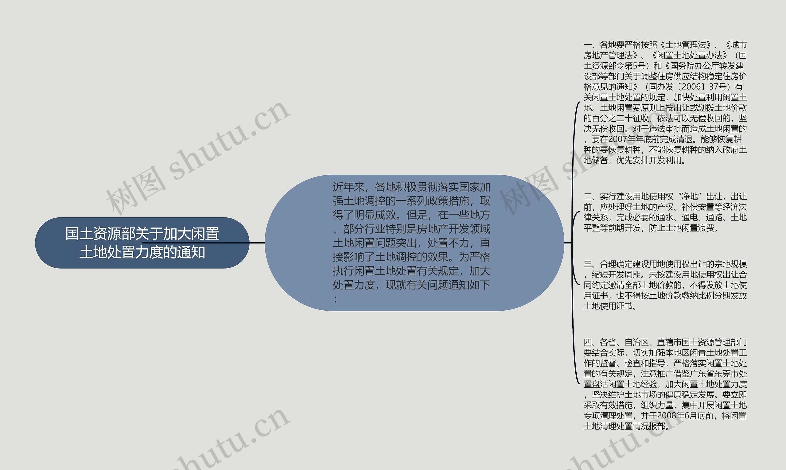 一、各地要严格按照《土地管理法》、《城市房地产管理法》、《闲置土地处置办法》(国土资源部令第5号)和《国务院办公厅转发建设部等部门关于调整住房供应结构稳定住房价格意见的通知》(国办发〔2006〕37号)有关闲置土地处置的规定,加快处置利用闲置土地。土地闲置费原则上按出让或划拨土地价款的百分之二十征收;依法可以无偿收回的,坚决无偿收回。对于违法审批而造成土地闲置的,要在2007年年底前完成清退。能够恢复耕种的要恢复耕种,不能恢复耕种的纳入政府土地储备,优先安排开发利用。