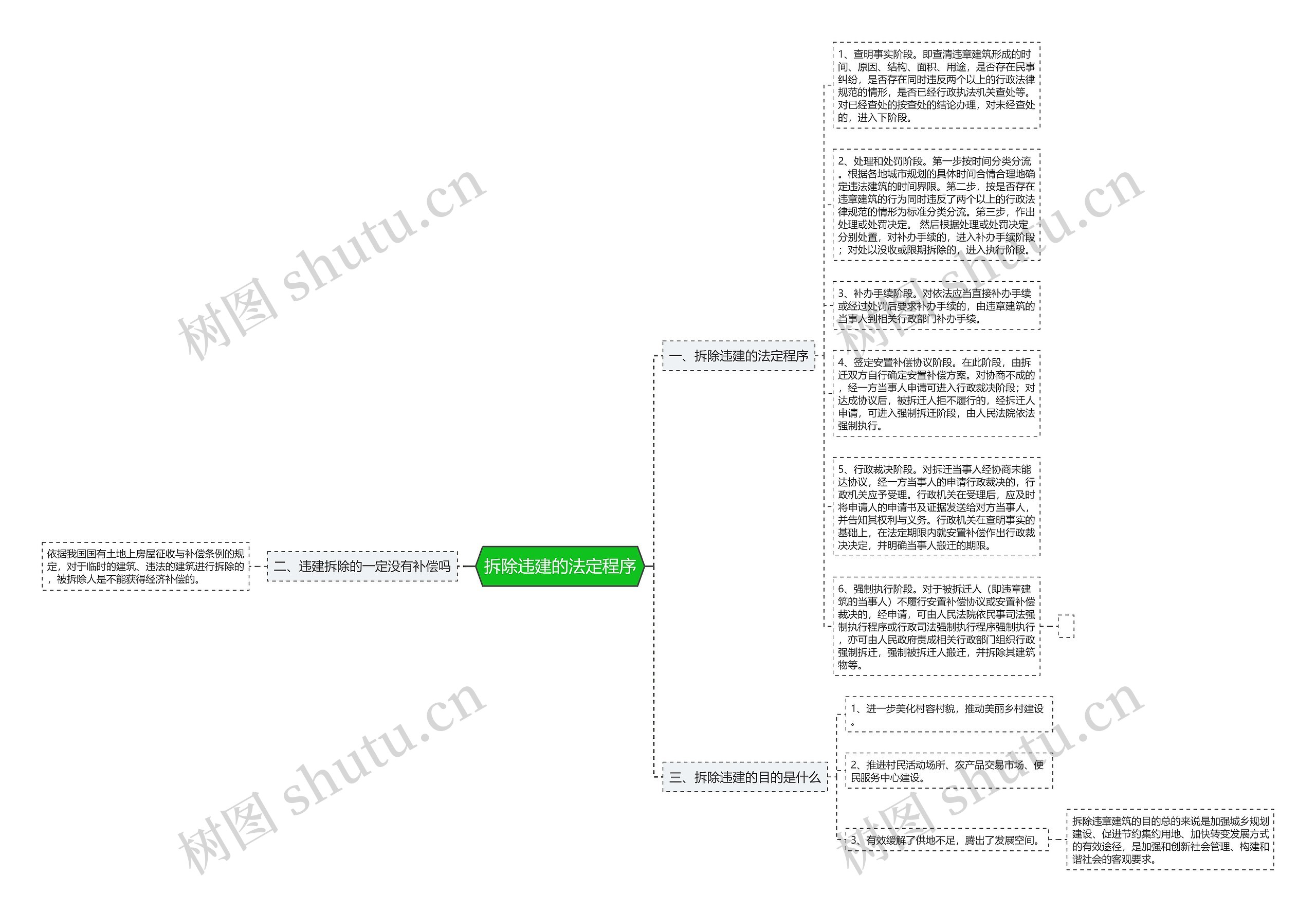 6、强制执行阶段。对于被拆迁人(即违章建筑的当事人)不履行安置补偿协议或安置补偿裁决的,经申请,可由人民法院依民事司法强制执行程序或行政司法强制执行程序强制执行,亦可由人民政府责成相关行政部门组织行政强制拆迁,强制被拆迁人搬迁,并拆除其建筑物等。