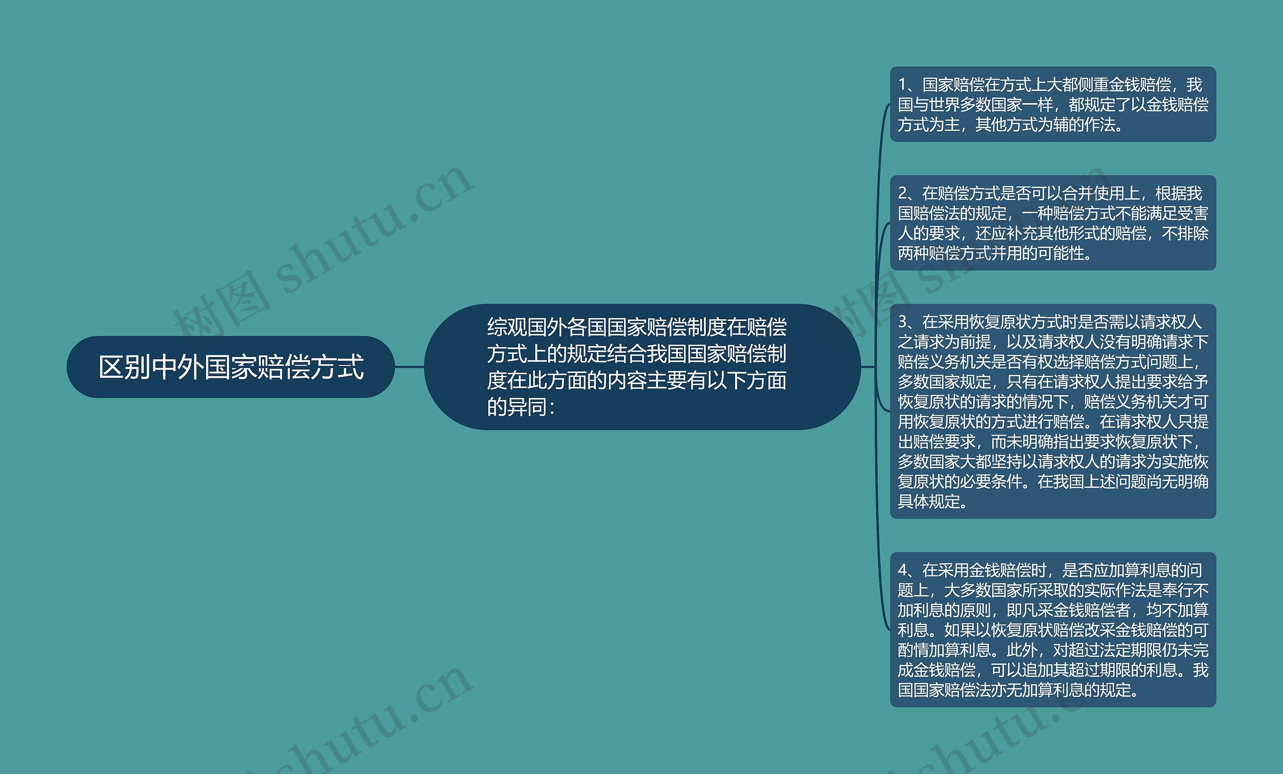 1、国家赔偿在方式上大都侧重金钱赔偿,我国与世界多数国家一样,都规定了以金钱赔偿方式为主,其他方式为辅的作法。