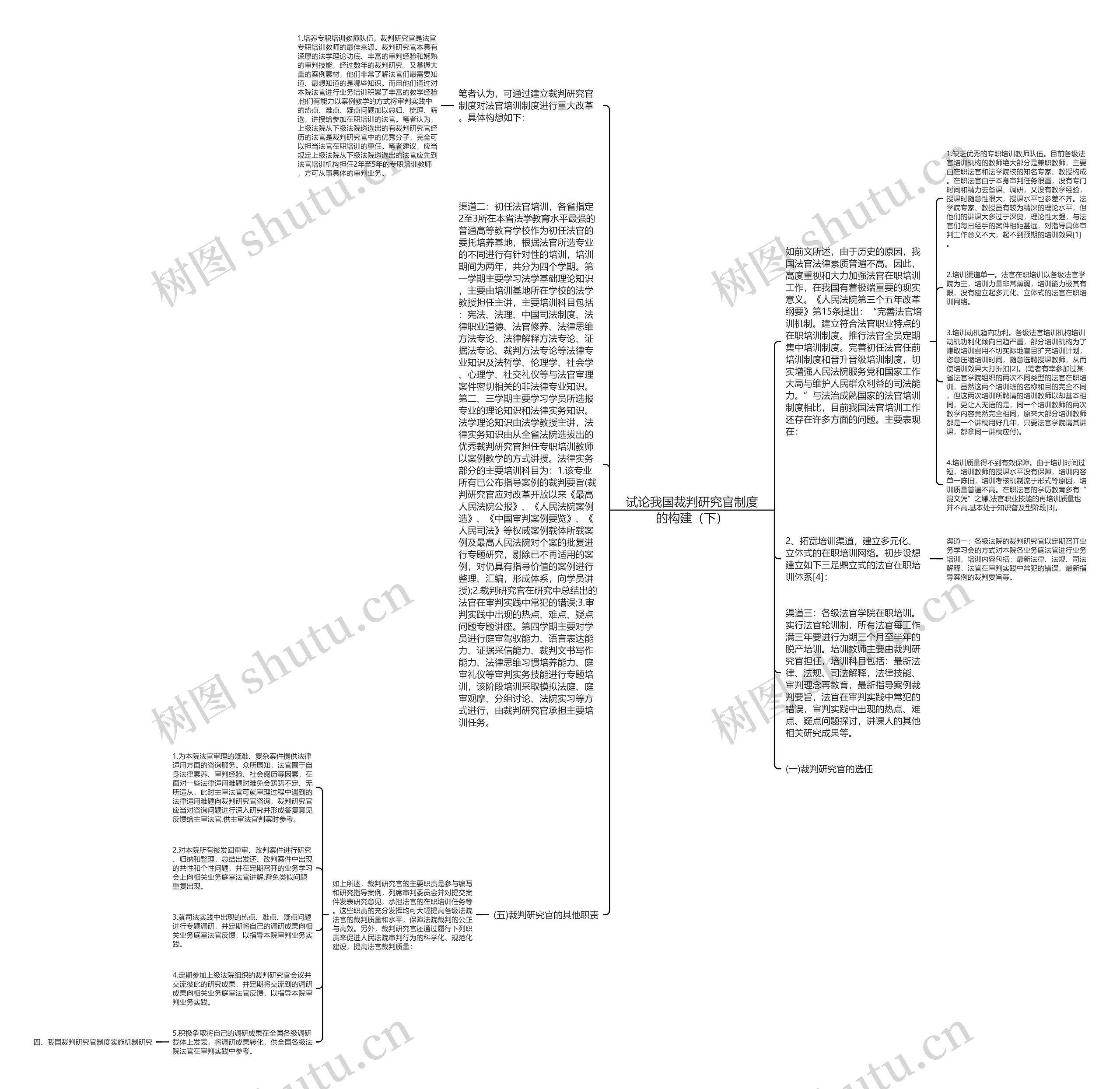 渠道二:初任法官培训,各省指定2至3所在本省法学教育水平最强的普通高等教育学校作为初任法官的委托培养基地,根据法官所选专业的不同进行有针对性的培训,培训期间为两年,共分为四个学期。第一学期主要学习法学基础理论知识,主要由培训基地所在学校的法学教授担任主讲,主要培训科目包括:宪法、法理、中国司法制度、法律职业道德、法官修养、法律思维方法专论、法律解释方法专论、证据法专论、裁判方法专论等法律专业知识及法哲学、伦理学、社会学、心理学、社交礼仪等与法官审理案件密切相关的非法律专业知识。第二、三学期主要学习学员所选报专业的理论知识和法律实务知识。法学理论知识由法学教授主讲,法律实务知识由从全省法院选拔出的优秀裁判研究官担任专职培训教师以案例教学的方式讲授。法律实务部分的主要培训科目为:1.该专业所有已公布指导案例的裁判要旨(裁判研究官应对改革开放以来《最高人民法院公报》、《人民法院案例选》、《中国审判案例要览》、《人民司法》等权威案例载体所载案例及最高人民法院对个案的批复进行专题研究,剔除已不再适用的案例,对仍具有指导价值的案例进行整理、汇编,形成体系,向学员讲授);2.裁判研究官在研究中总结出的法官在审判实践中常犯的错误;3.审判实践中出现的热点、难点、疑点问题专题讲座。第四学期主要对学员进行庭审驾驭能力、语言表达能力、证据采信能力、裁判文书写作能力、法律思维习惯培养能力、庭审礼仪等审判实务技能进行专题培训,该阶段培训采取模拟法庭、庭审观摩、分组讨论、法院实习等方式进行,由裁判研究官承担主要培训任务。