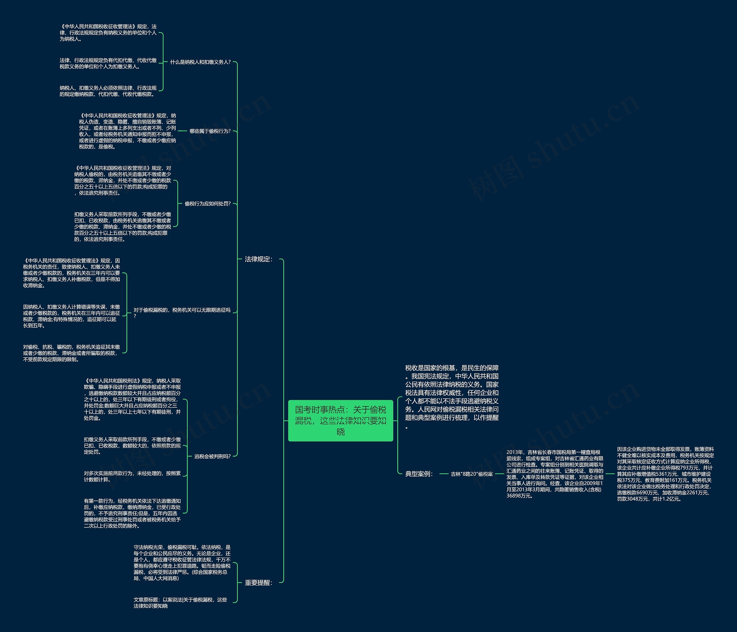 树图思维导图提供《国考时事热点:关于偷税漏税,这些法律知识要知晓》在线思维导图免费制作,点击“编辑”按钮,可对《国考时事热点:关于偷税漏税,这些法律知识要知晓》进行在线思维导图编辑,本思维导图属于思维导图模板主题,文件编号是:289307ee971d77061037371bd5059426
