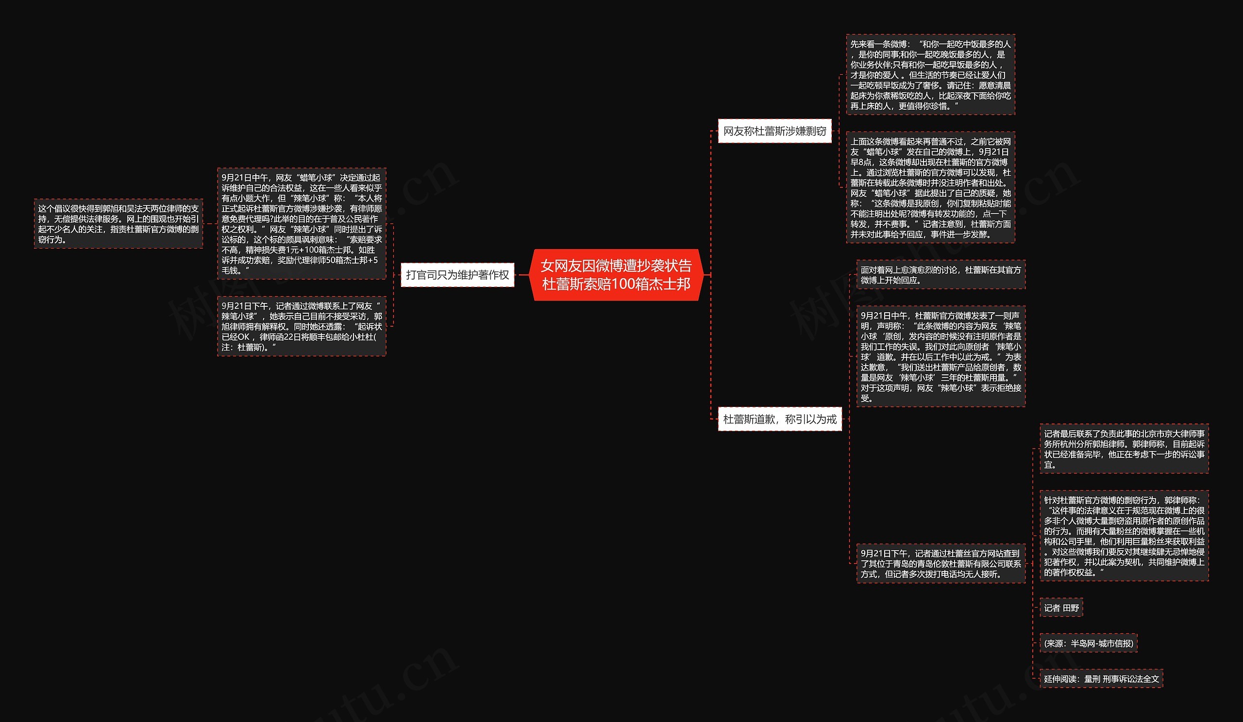 树图思维导图提供《女网友因微博遭抄袭状告杜蕾斯索赔100箱杰士邦》在线思维导图免费制作,点击“编辑”按钮,可对《女网友因微博遭抄袭状告杜蕾斯索赔100箱杰士邦》进行在线思维导图编辑,本思维导图属于思维导图模板主题,文件编号是:613149a13ac2af0c64adde51a9ef13d5