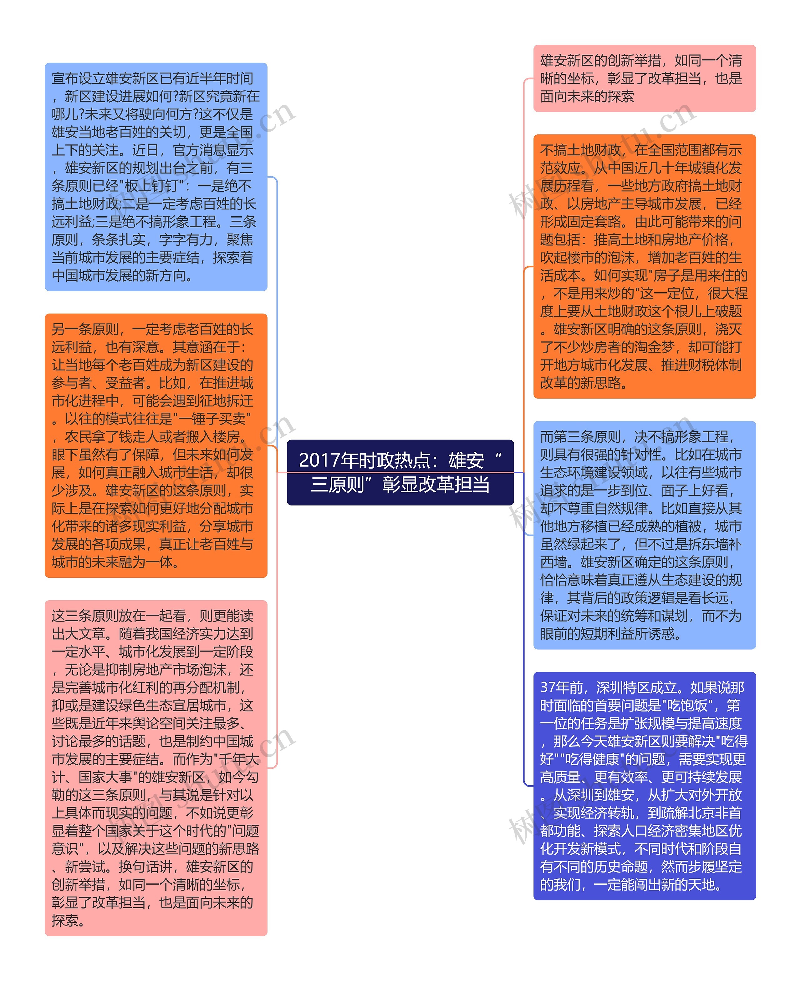 这三条原则放在一起看,则更能读出大文章。随着我国经济实力达到一定水平、城市化发展到一定阶段,无论是抑制房地产市场泡沫,还是完善城市化红利的再分配机制,抑或是建设绿色生态宜居城市,这些既是近年来舆论空间关注最多、讨论最多的话题,也是制约中国城市发展的主要症结。而作为"千年大计、国家大事"的雄安新区,如今勾勒的这三条原则,与其说是针对以上具体而现实的问题,不如说更彰显着整个国家关于这个时代的"问题意识",以及解决这些问题的新思路、新尝试。换句话讲,雄安新区的创新举措,如同一个清晰的坐标,彰显了改革担当,也是面向未来的探索。