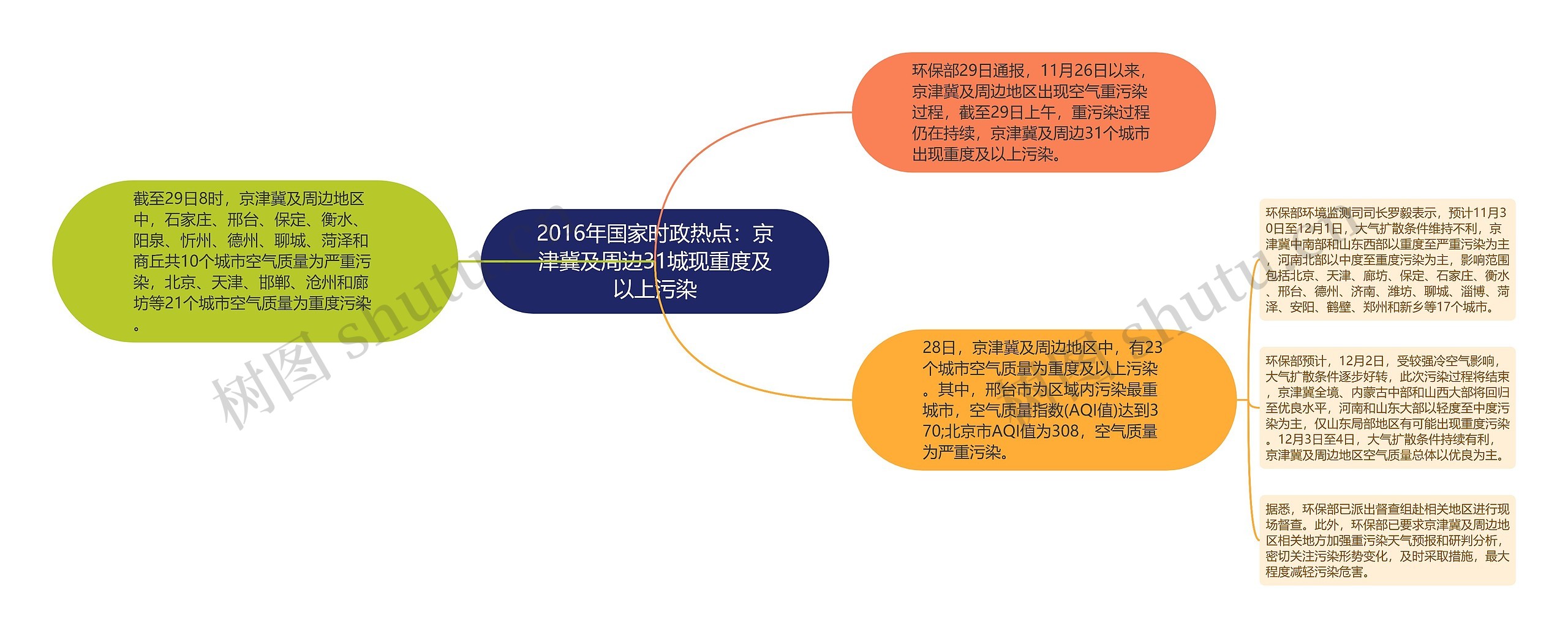 树图思维导图提供《2016年国家时政热点:京津冀及周边31城现重度及以上污染》在线思维导图免费制作,点击“编辑”按钮,可对《2016年国家时政热点:京津冀及周边31城现重度及以上污染》进行在线思维导图编辑,本思维导图属于思维导图模板主题,文件编号是:7dfffaa4cc0139766fcada85d11eb74d