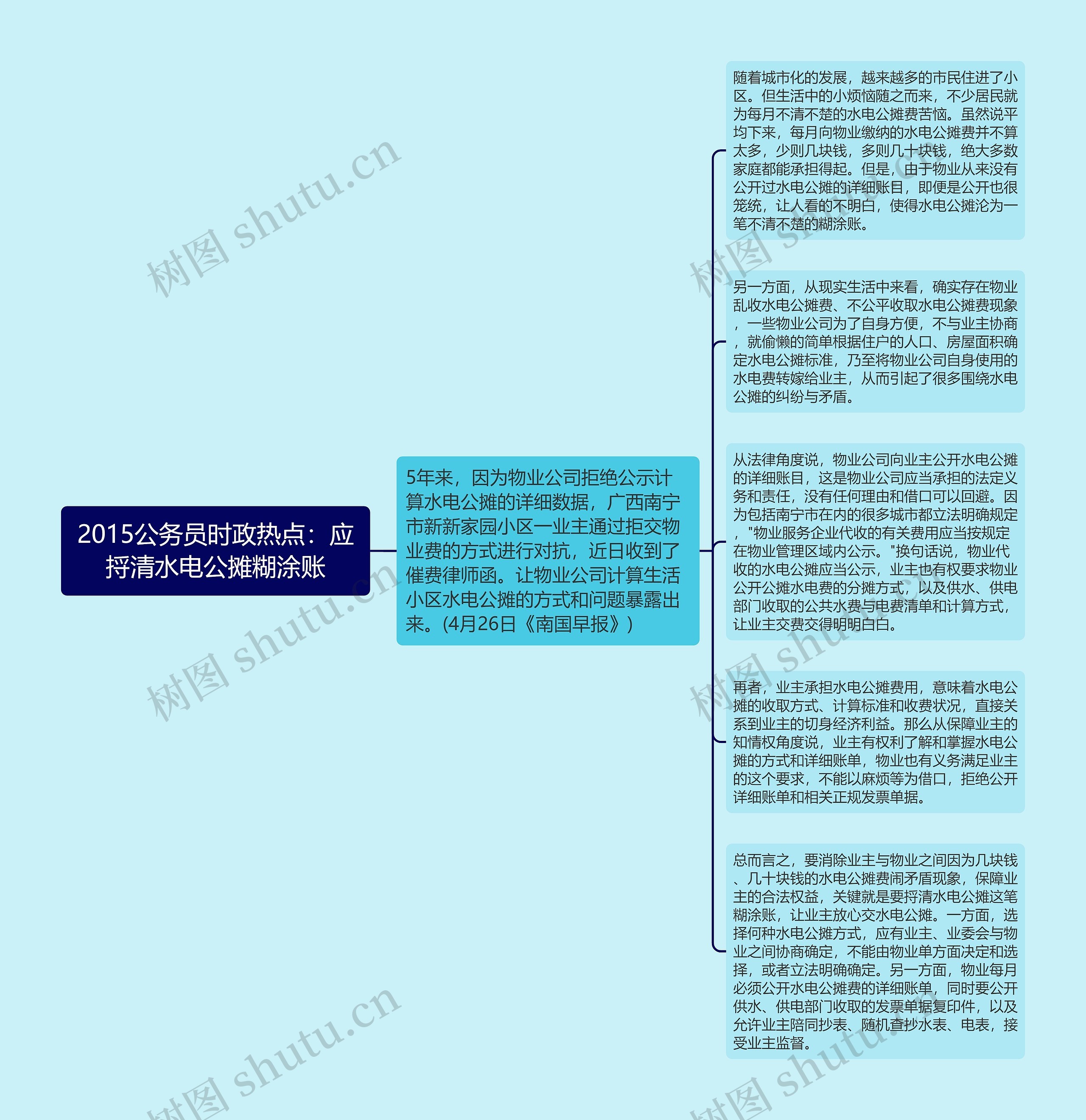 总而言之,要消除业主与物业之间因为几块钱、几十块钱的水电公摊费闹矛盾现象,保障业主的合法权益,关键就是要捋清水电公摊这笔糊涂账,让业主放心交水电公摊。一方面,选择何种水电公摊方式,应有业主、业委会与物业之间协商确定,不能由物业单方面决定和选择,或者立法明确确定。另一方面,物业每月必须公开水电公摊费的详细账单,同时要公开供水、供电部门收取的发票单据复印件,以及允许业主陪同抄表、随机查抄水表、电表,接受业主监督。