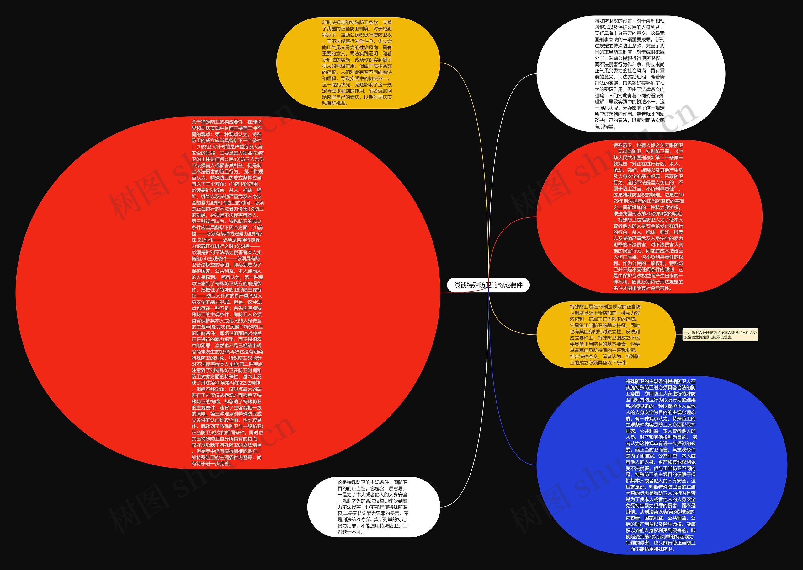关于特殊防卫的构成要件,在理论界和司法实践中目前主要有三种不同的观点:第一种观点认为,特殊防卫的成立应当具备以下三个条件:(1)防卫人针对的是严重危及人身安全的犯罪,主要是暴力犯罪;(2)防卫的主体是任何公民;(3)防卫人杀伤不法侵害人或损害其利益,仍是制止不法侵害的防卫行为。 第二种观点认为,特殊防卫的成立条件应当有以下三个方面:(1)防卫的范围,必须是针对行凶、杀人、抢劫、强奸、绑架以及其他严重危及人身安全的暴力犯罪;(2)防卫的时间,必须是正在进行的不法暴力侵害;(3)防卫的对象,必须是不法侵害者本人。第三种观点认为,特殊防卫的成立条件应当具备以下四个方面:(1)前提——必须有某种特定暴力犯罪存在;(2)时机——必须是某种特定暴力犯罪正在进行之时;(3)对象——必须是针对不法暴力侵害者本人实施的;(4)主观条件——必须具有防卫合法权益的意图,即必须是为了保护国家、公共利益、本人或他人的人身权利。 笔者认为,第一种观点注意到了特殊防卫成立的前提条件,把握住了特殊防卫的最主要特征——防卫人针对的是严重危及人身安全的暴力犯罪。但是,这种观点也存在一些不足:首先它忽视特殊防卫的主观条件,即防卫人必须具有保护其本人或他人的人身安全的主观意图;其次它忽略了特殊防卫的时间条件,即防卫的前提必须是正在进行的暴力犯罪,而不是想象中的犯罪,当然也不是已经结束或者尚未发生的犯罪;再次它没有明确特殊防卫的对象,特殊防卫只能针对不法侵害者本人实施;第二种观点注意到了对特殊防卫在防卫时间和防卫对象方面的特殊性,基本上反映了刑法第20条第3款的立法精神,但尚不够全面。该观点最大的缺陷在于它仅仅从客观方面考察了特殊防卫的构成,却忽略了特殊防卫的主观要件,违背了主客观相一致的原则。第三种观点对特殊防卫成立条件的认识比较全面,也比较具体。既谈到了特殊防卫与一般防卫(正当防卫)成立的相同条件,同时也突出特殊防卫自身所具有的特点,较好地反映了特殊防卫的立法精神。但是其中仍有值得商榷的地方,如特殊防卫的主观条件内容等,尚有待于进一步完善。