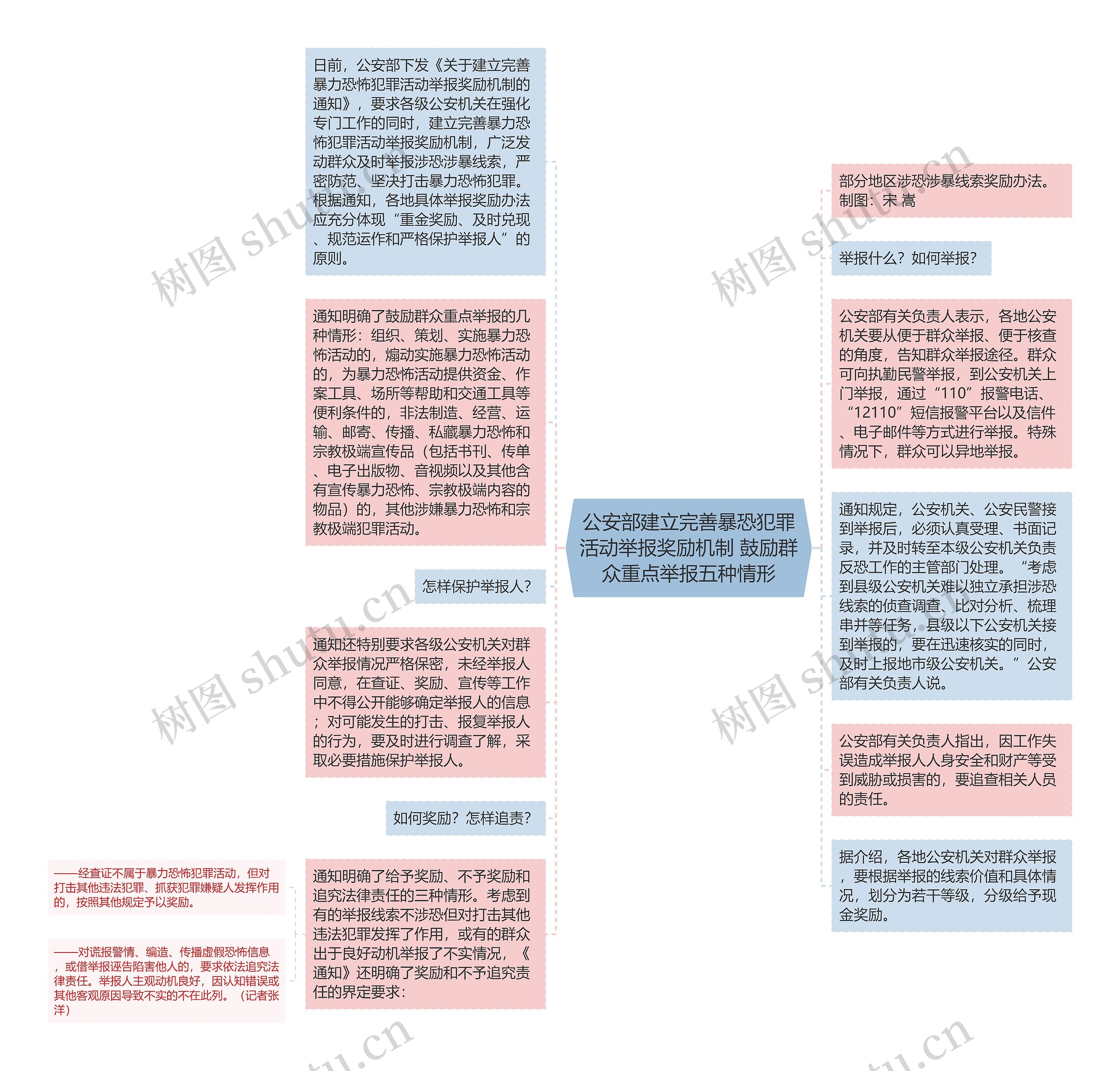 日前,公安部下发《关于建立完善暴力恐怖犯罪活动举报奖励机制的通知》,要求各级公安机关在强化专门工作的同时,建立完善暴力恐怖犯罪活动举报奖励机制,广泛发动群众及时举报涉恐涉暴线索,严密防范、坚决打击暴力恐怖犯罪。根据通知,各地具体举报奖励办法应充分体现“重金奖励、及时兑现、规范运作和严格保护举报人”的原则。