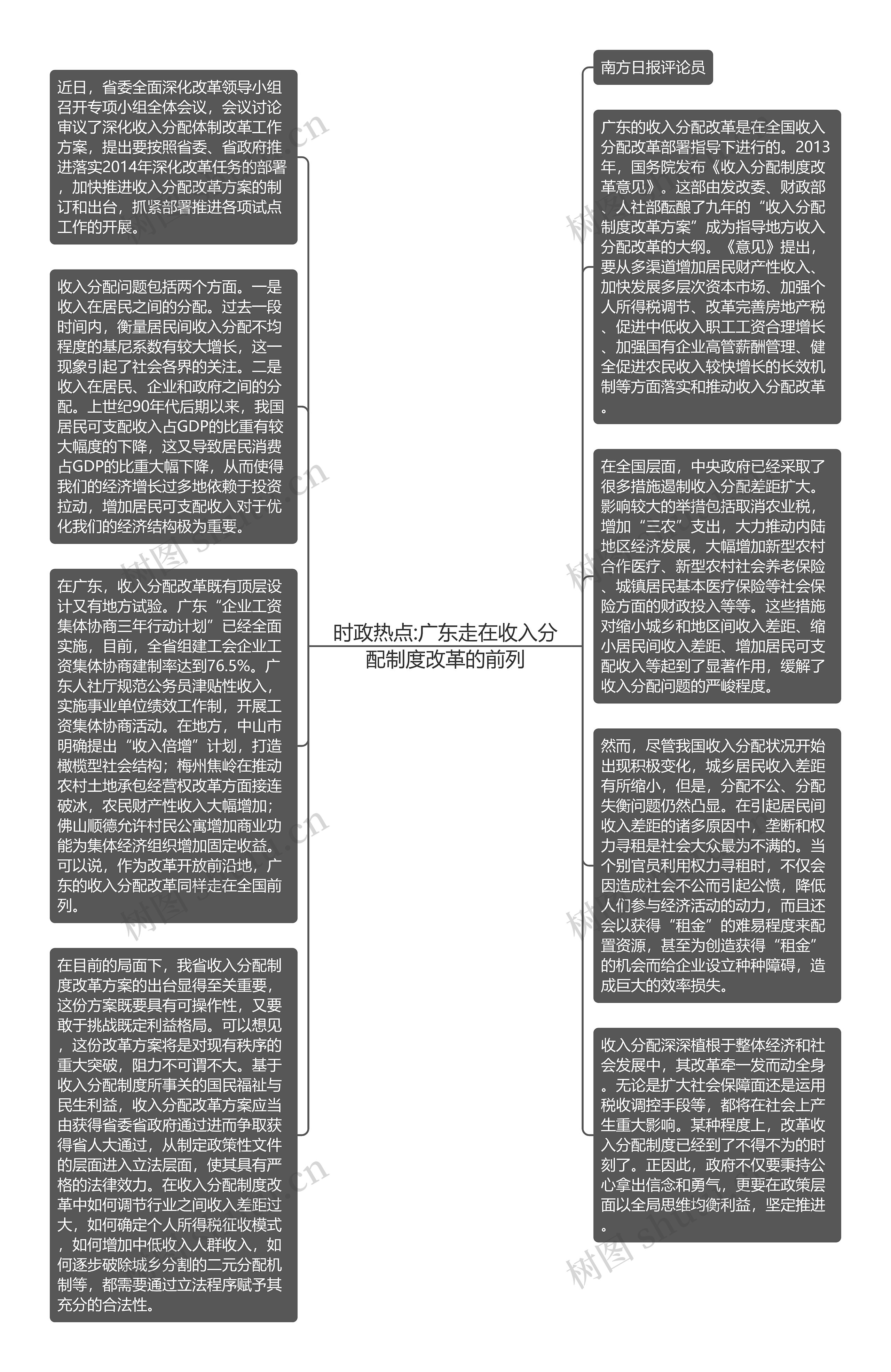 广东的收入分配改革是在全国收入分配改革部署指导下进行的。2013年,国务院发布《收入分配制度改革意见》。这部由发改委、财政部、人社部酝酿了九年的“收入分配制度改革方案”成为指导地方收入分配改革的大纲。《意见》提出,要从多渠道增加居民财产性收入、加快发展多层次资本市场、加强个人所得税调节、改革完善房地产税、促进中低收入职工工资合理增长、加强国有企业高管薪酬管理、健全促进农民收入较快增长的长效机制等方面落实和推动收入分配改革。
