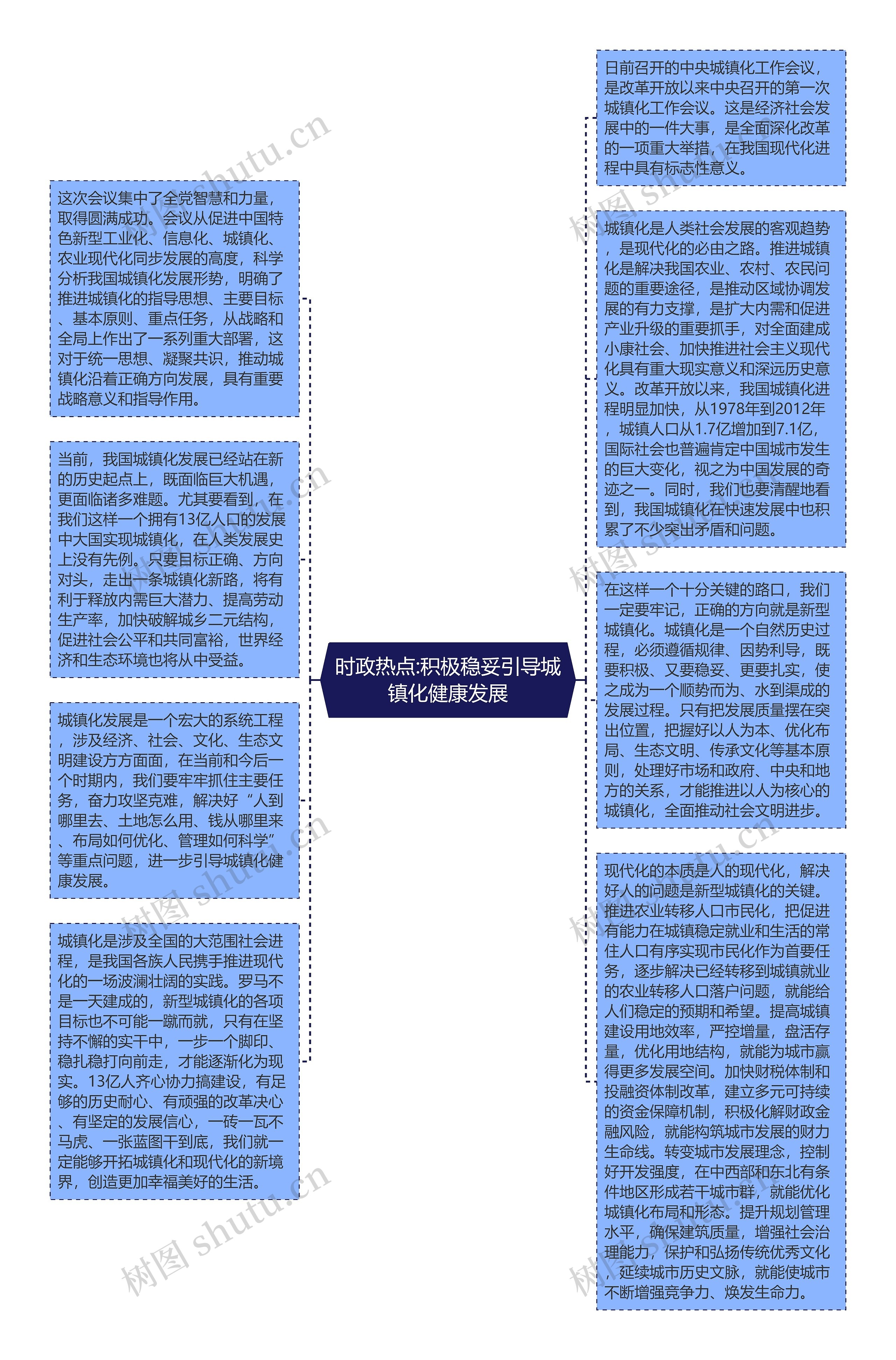在这样一个十分关键的路口,我们一定要牢记,正确的方向就是新型城镇化。城镇化是一个自然历史过程,必须遵循规律、因势利导,既要积极、又要稳妥、更要扎实,使之成为一个顺势而为、水到渠成的发展过程。只有把发展质量摆在突出位置,把握好以人为本、优化布局、生态文明、传承文化等基本原则,处理好市场和政府、中央和地方的关系,才能推进以人为核心的城镇化,全面推动社会文明进步。
