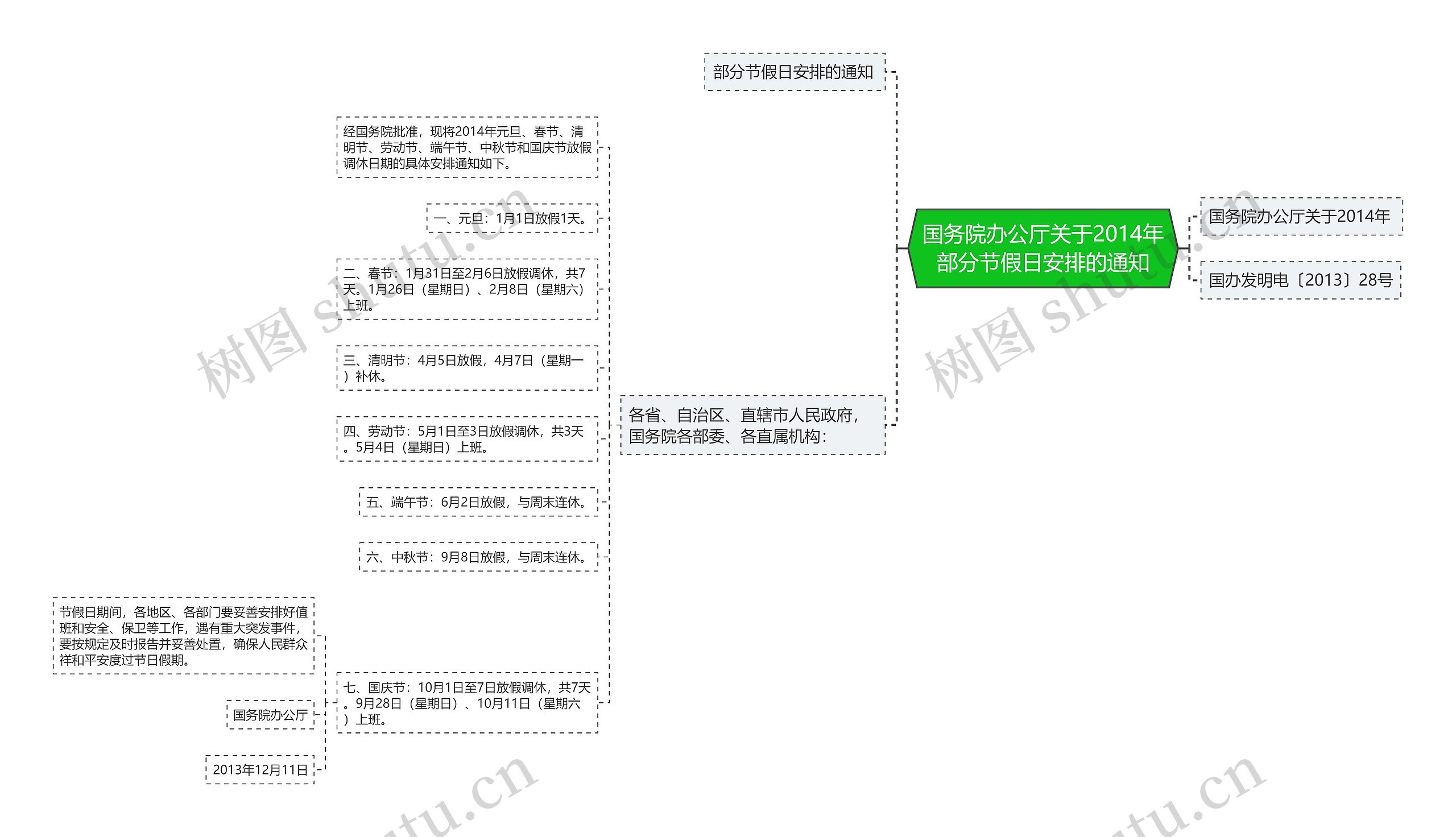 树图思维导图提供《国务院办公厅关于2014年部分节假日安排的通知》在线思维导图免费制作,点击“编辑”按钮,可对《国务院办公厅关于2014年部分节假日安排的通知》进行在线思维导图编辑,本思维导图属于思维导图模板主题,文件编号是:df5b0293d044818ef3a772e29052bc6f