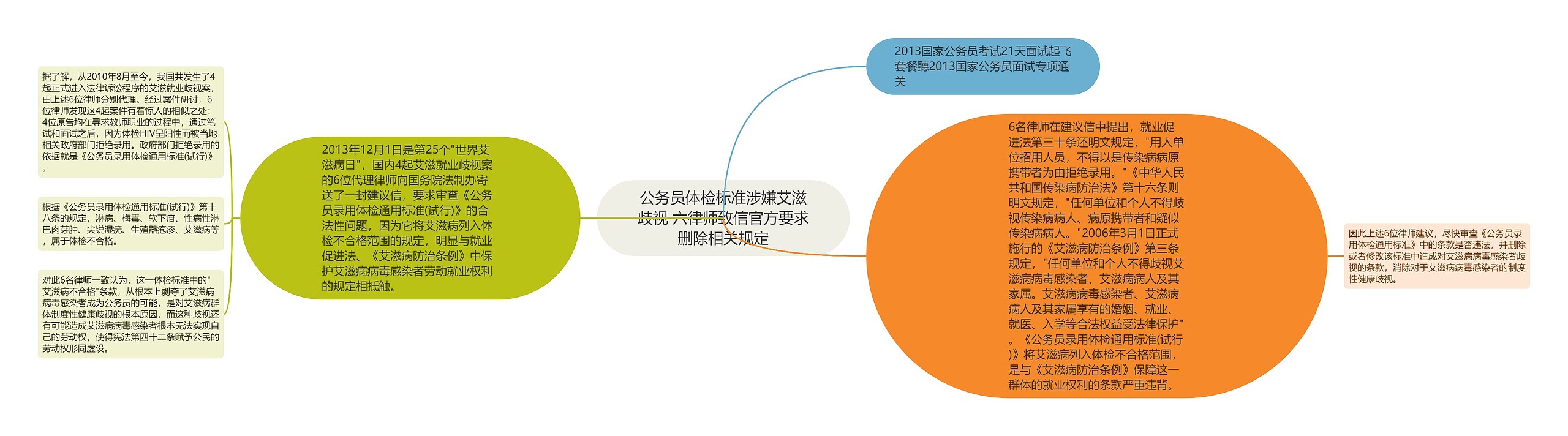 树图思维导图提供《公务员体检标准涉嫌艾滋歧视 六律师致信官方要求删除相关规定》在线思维导图免费制作,点击“编辑”按钮,可对《公务员体检标准涉嫌艾滋歧视 六律师致信官方要求删除相关规定》进行在线思维导图编辑,本思维导图属于思维导图模板主题,文件编号是:2c2bbad89b4be50089238447c1db9d1b